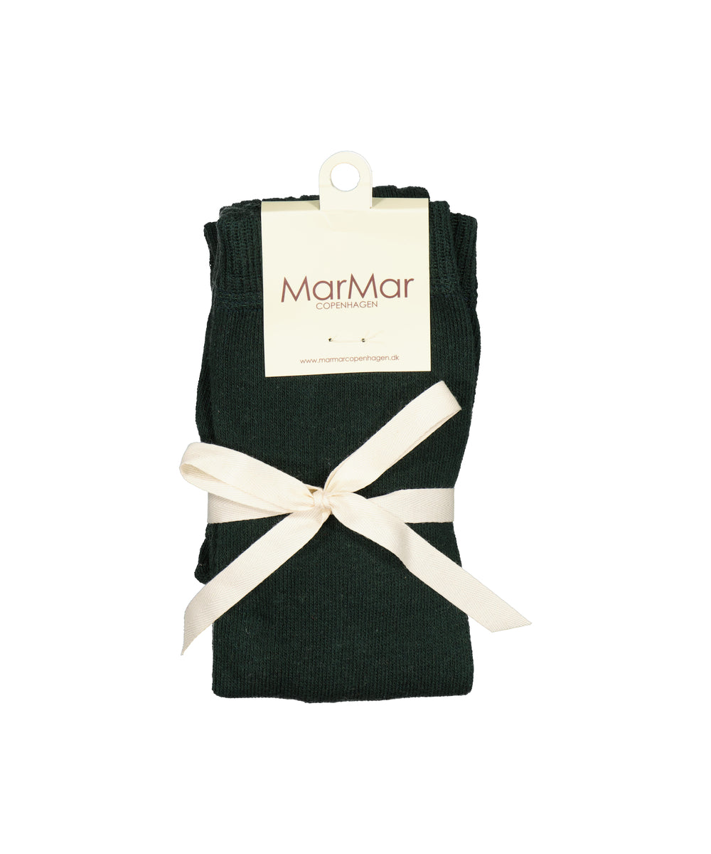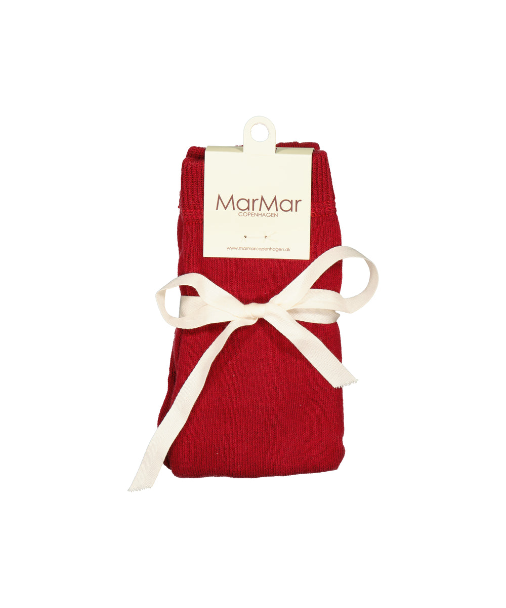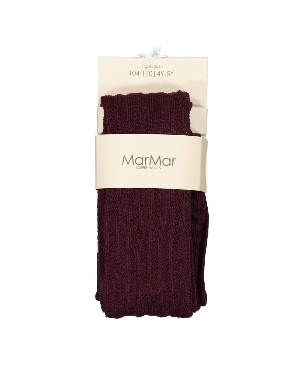 Lille pige iført cremefarvede ribstrikkede strømpebukser og ternet julekjole