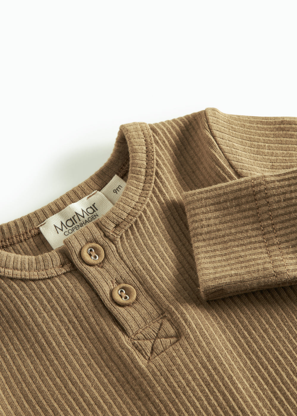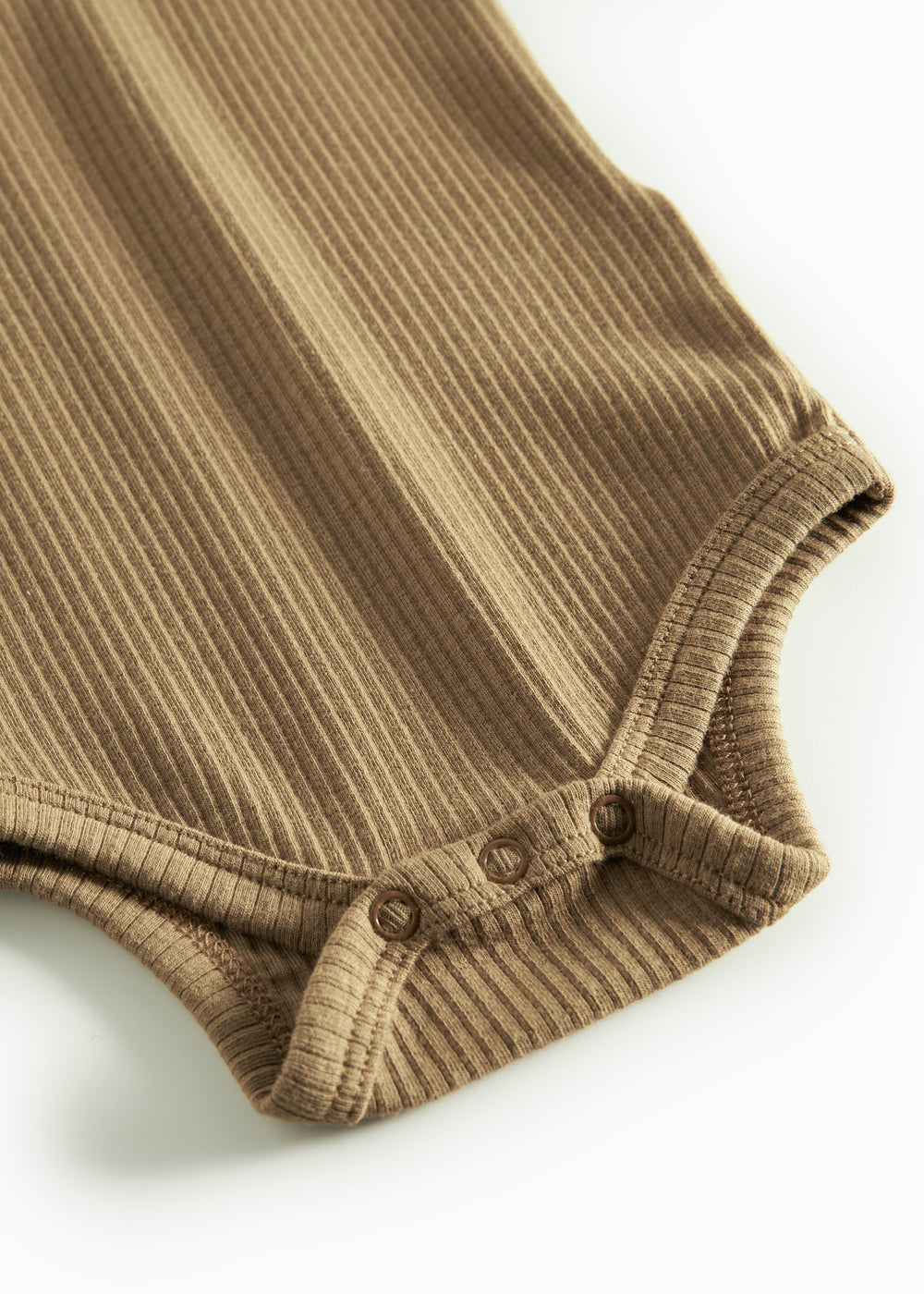 Brun ribstrikket babybody med lange ærmer, stolpe knaplukning og trykknapper mellem benene