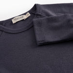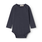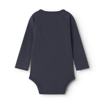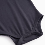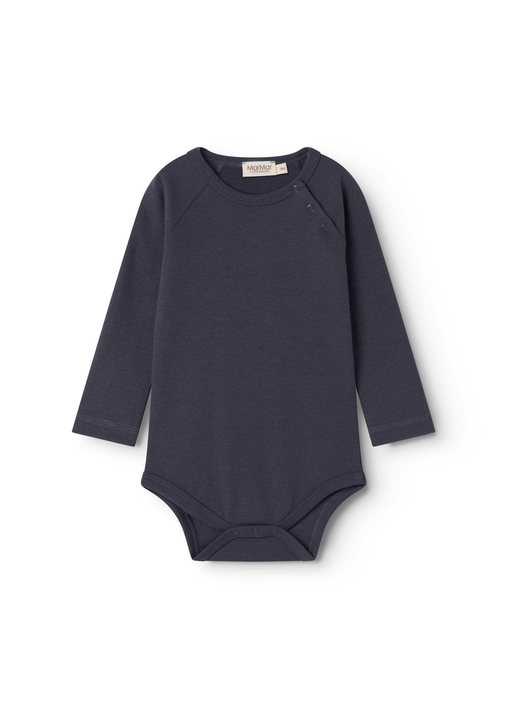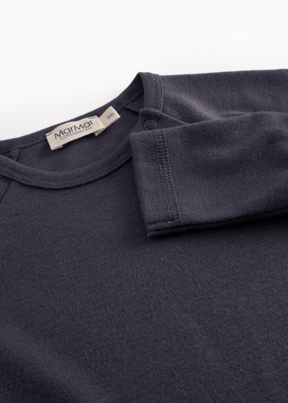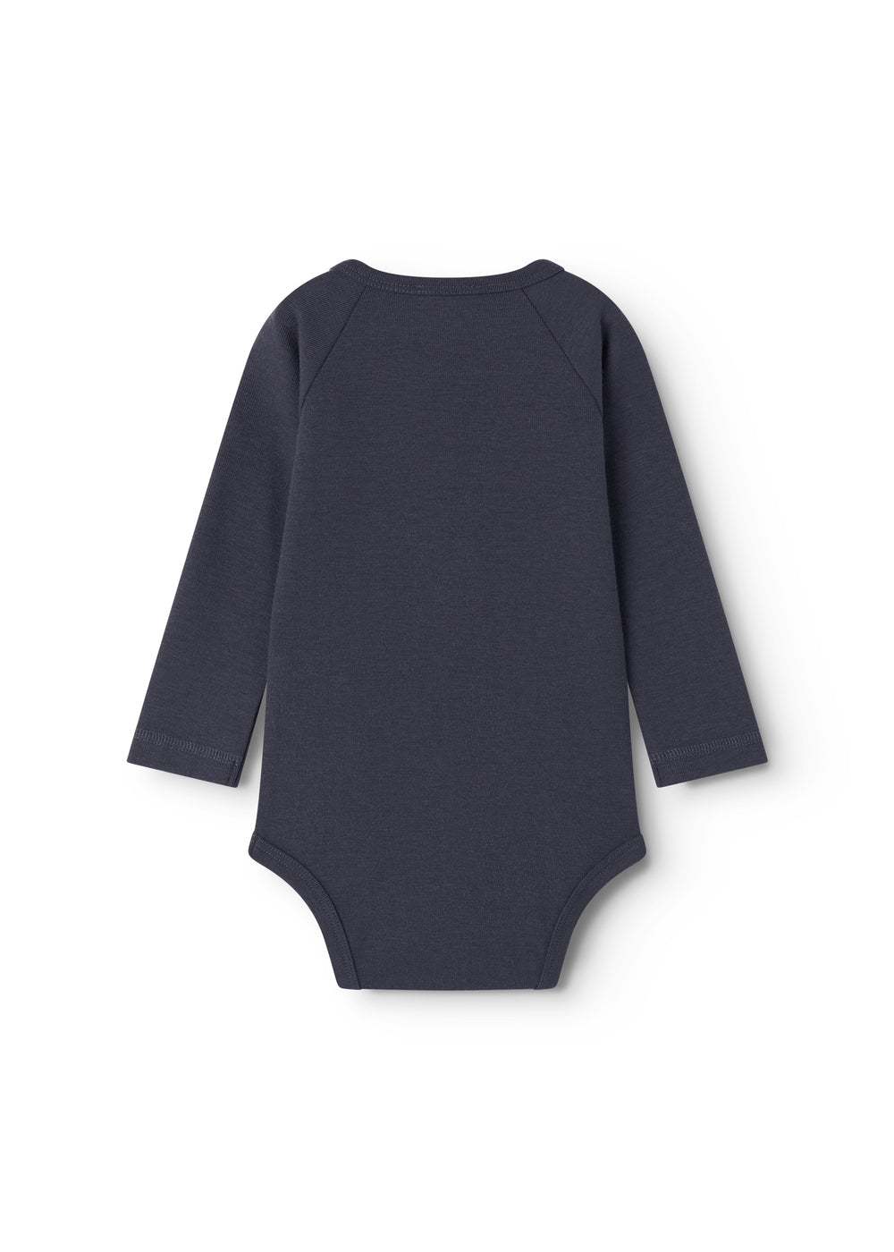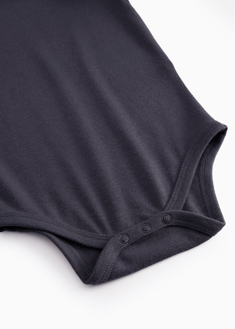 Simple long-sleeved bodystocking that closes with snaps in front of the left shoulder and between the legs for easy diaper changes.