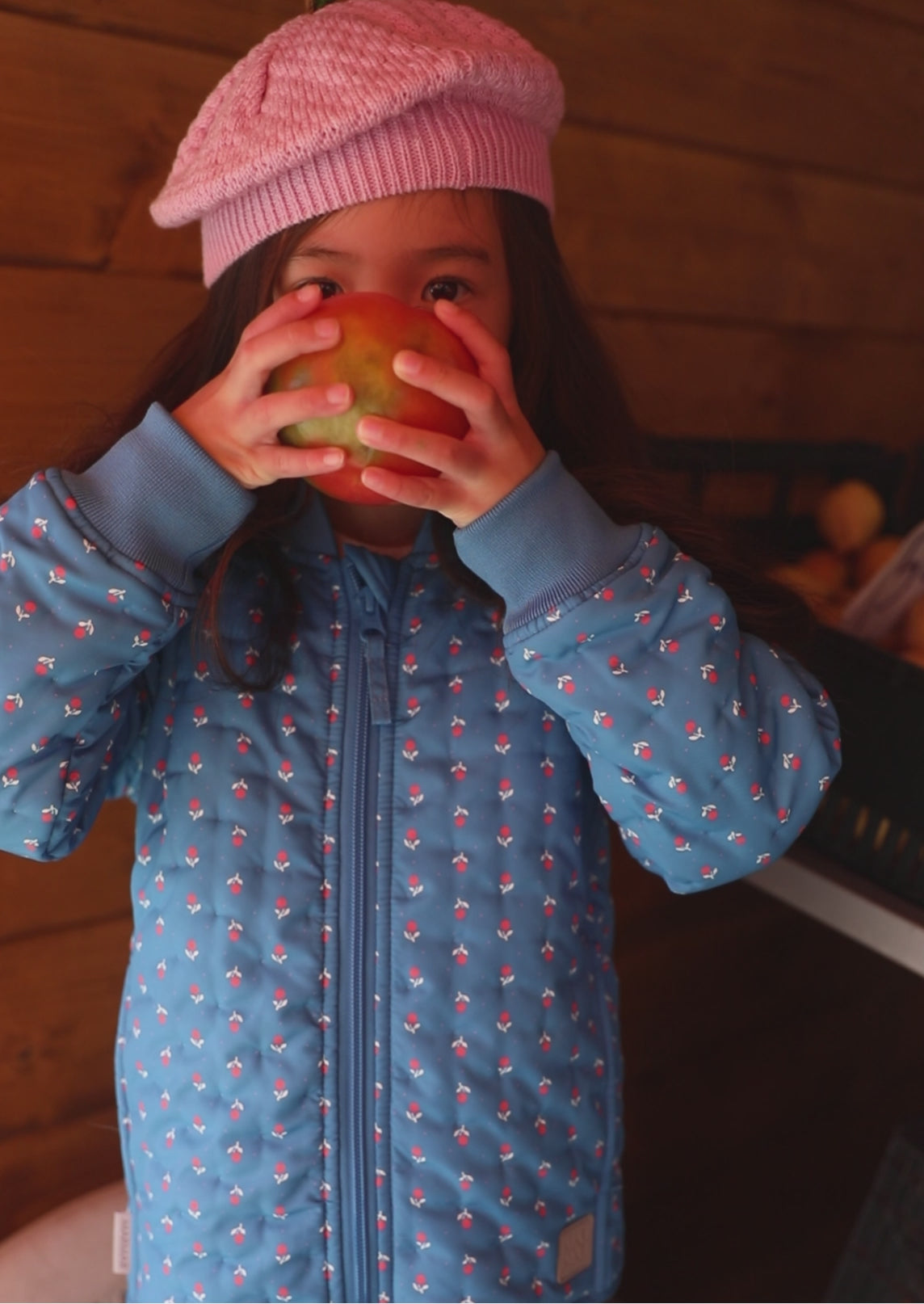 Children in a blue thermal jacket with a floral print and a bright red knitted hat.