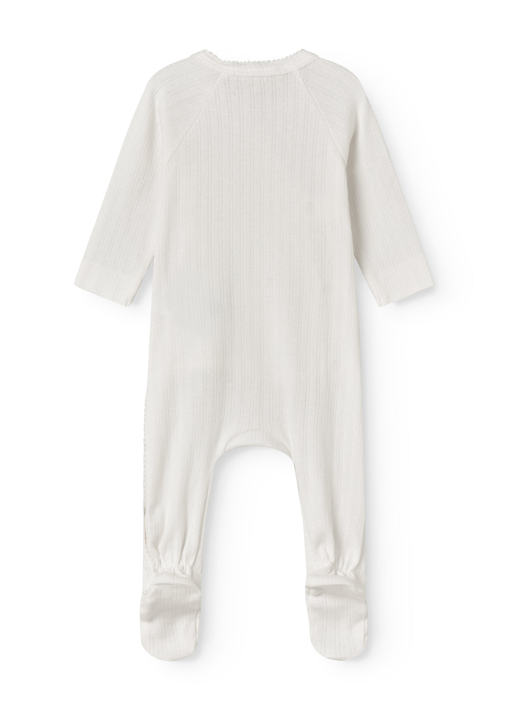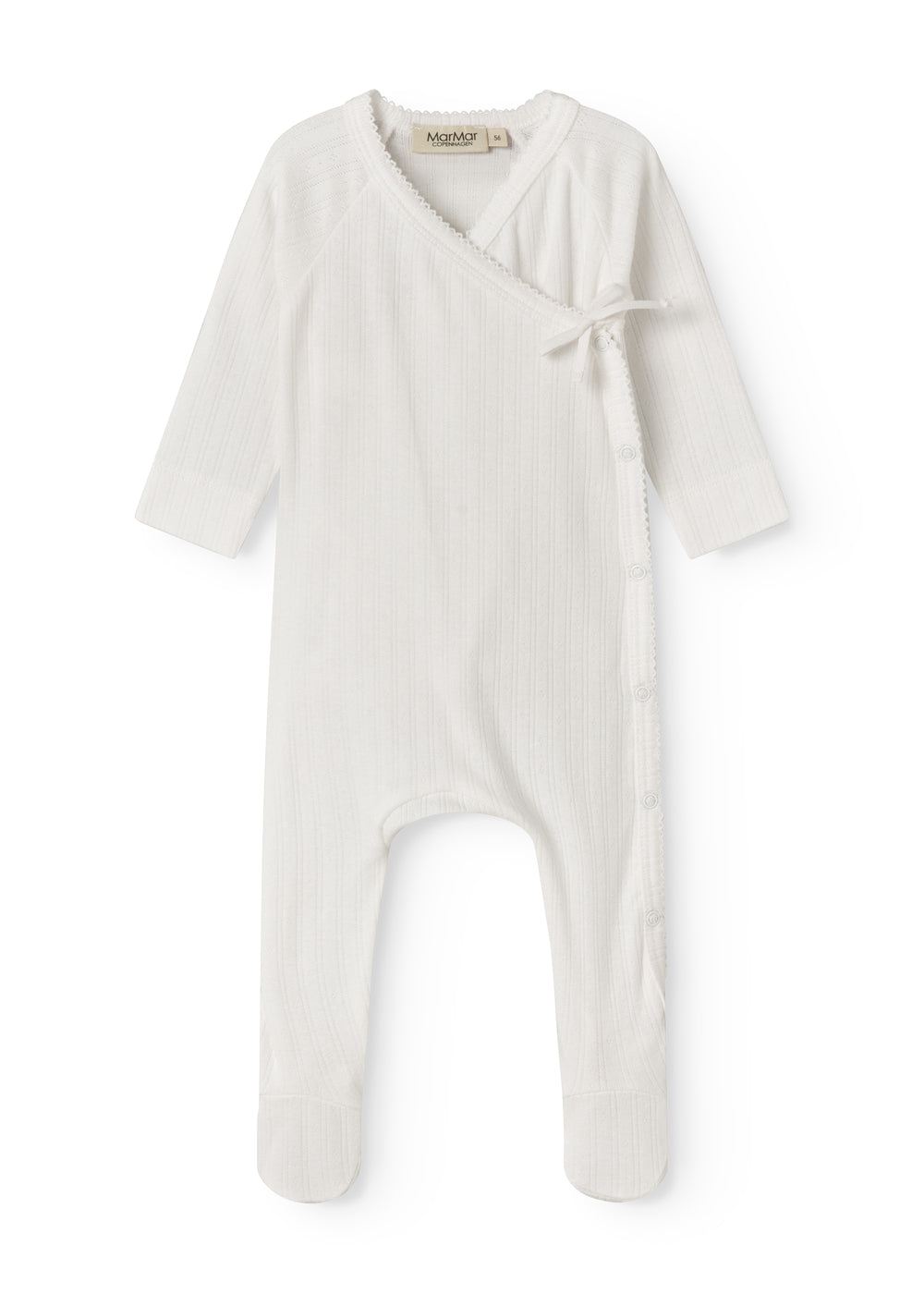 Long-sleeved pointelle onesie with feet for newborns. The onesie has a wrap-around closure, picot edges and closes with snaps and ties from the neck down one leg. The onesie is soft, stretchy and comfortable to wear.