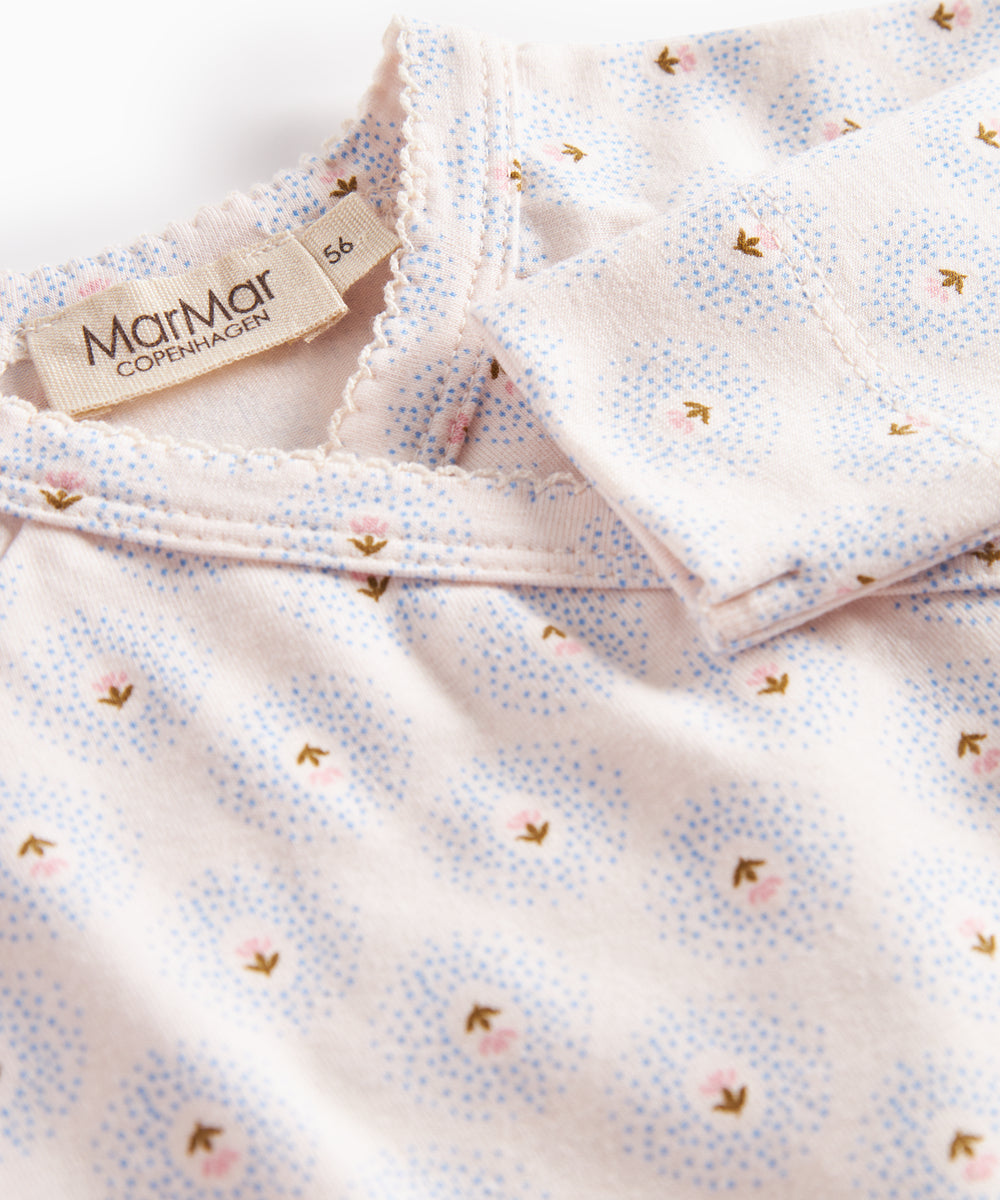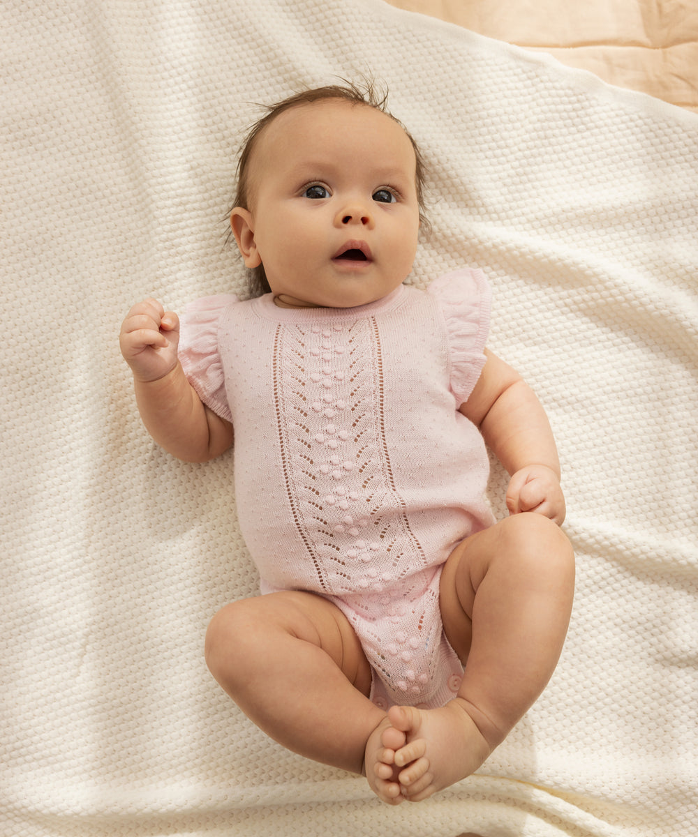 Baby iført støvet rosa body med flæsekrave
