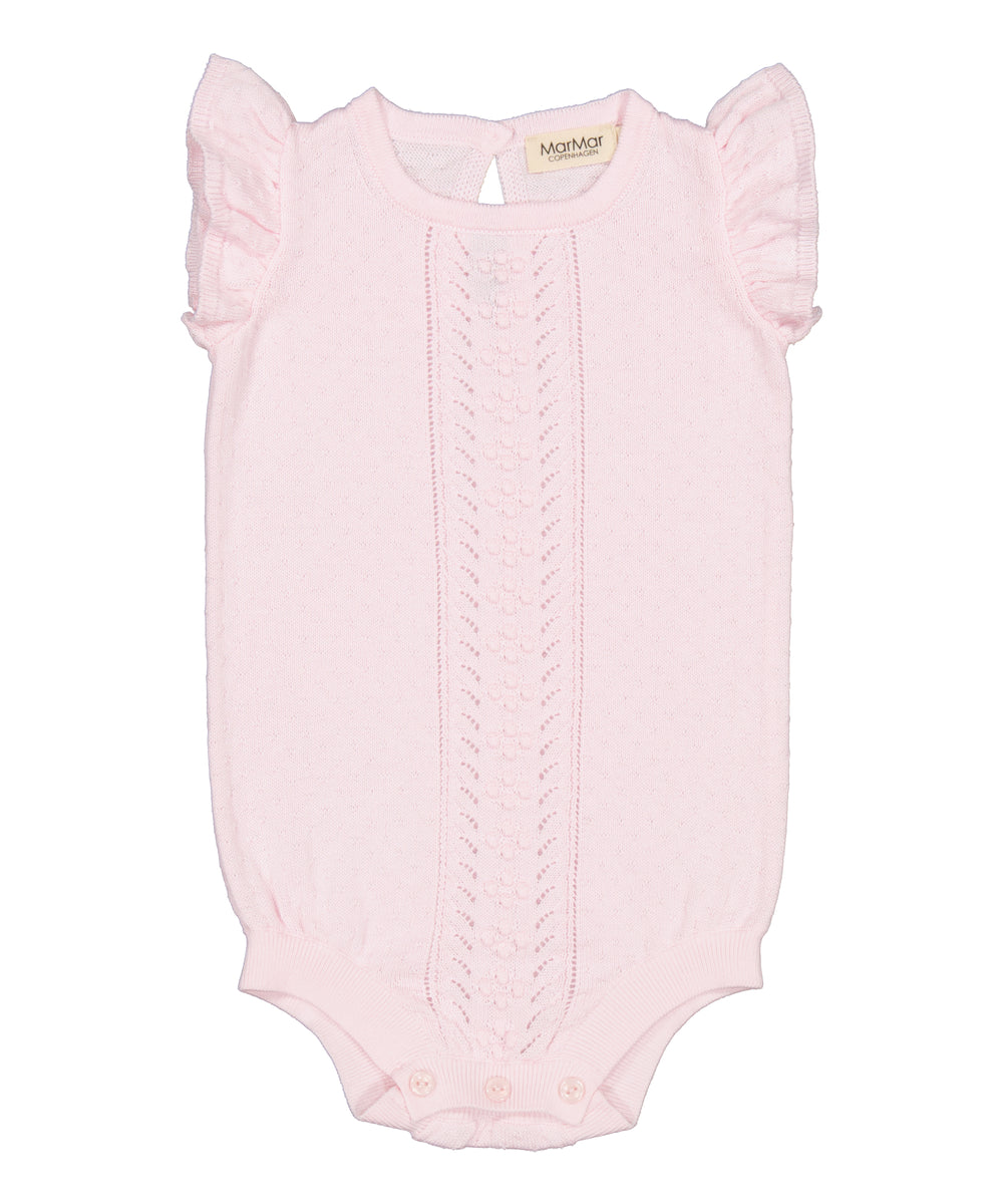 Støvet rosa ribstrikket babybody med flæsekrave og lange ærmer