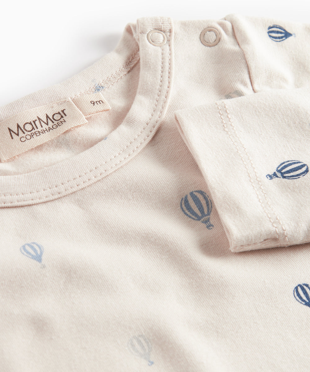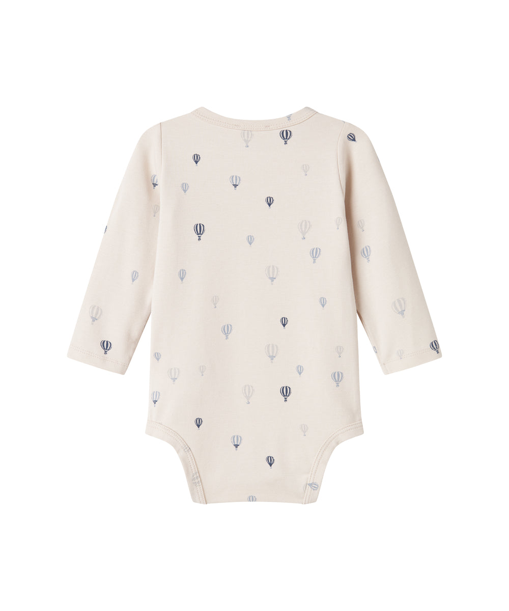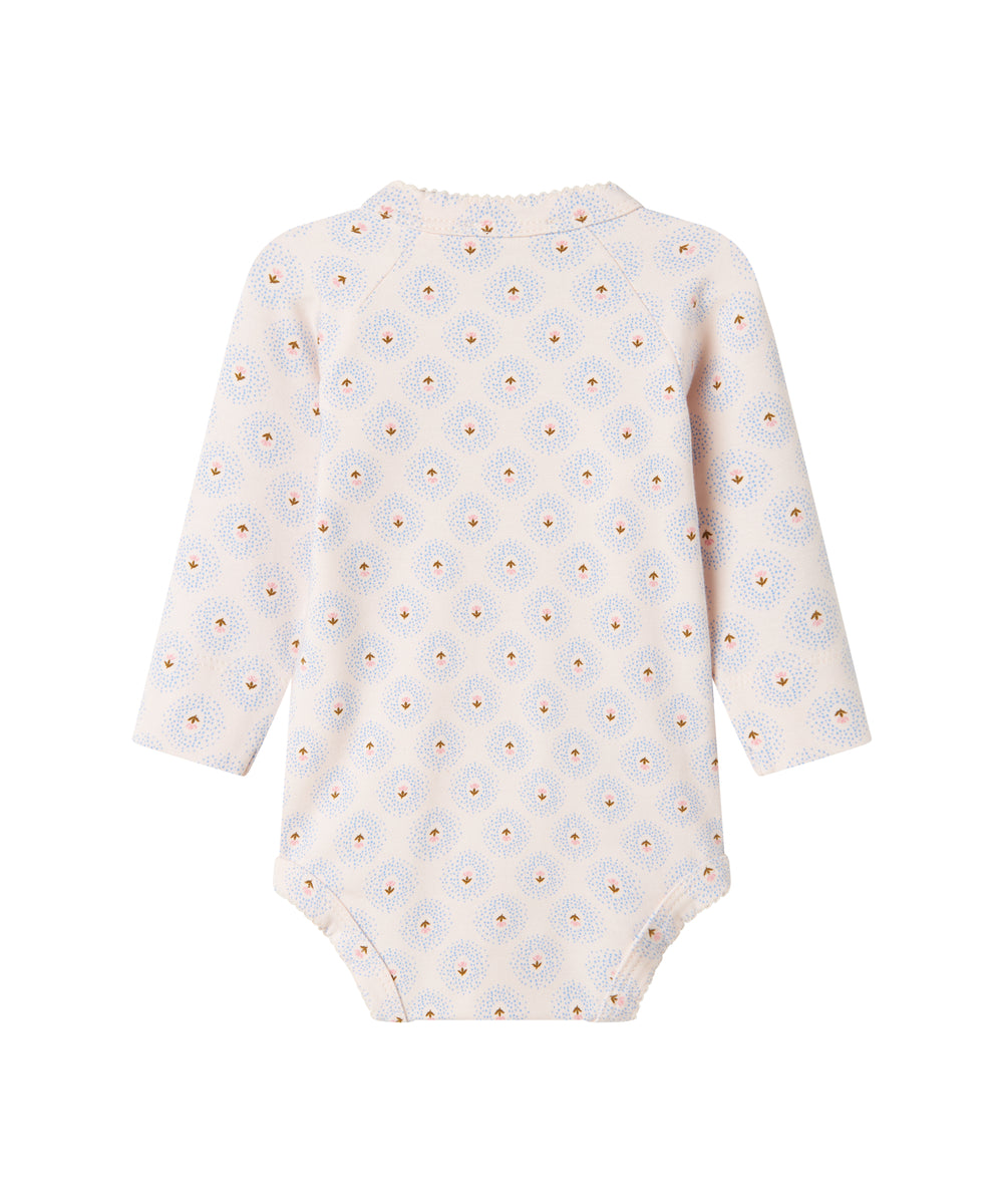 Blå langærmet body til baby med enhjørningemønster og flæsekrave
