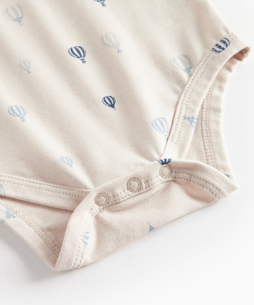 Baby iført blå body med enhjørningemønster og flæsekrave