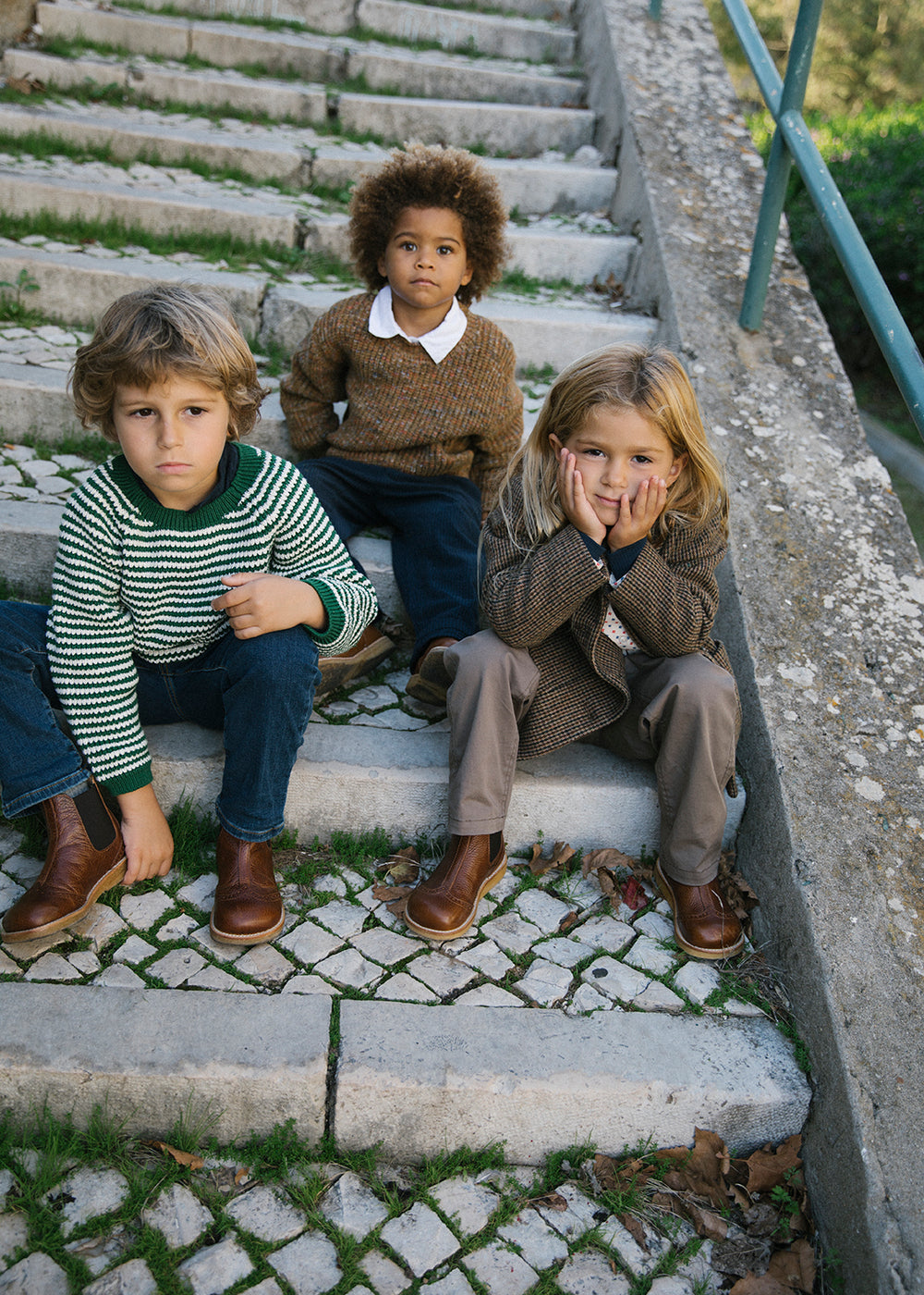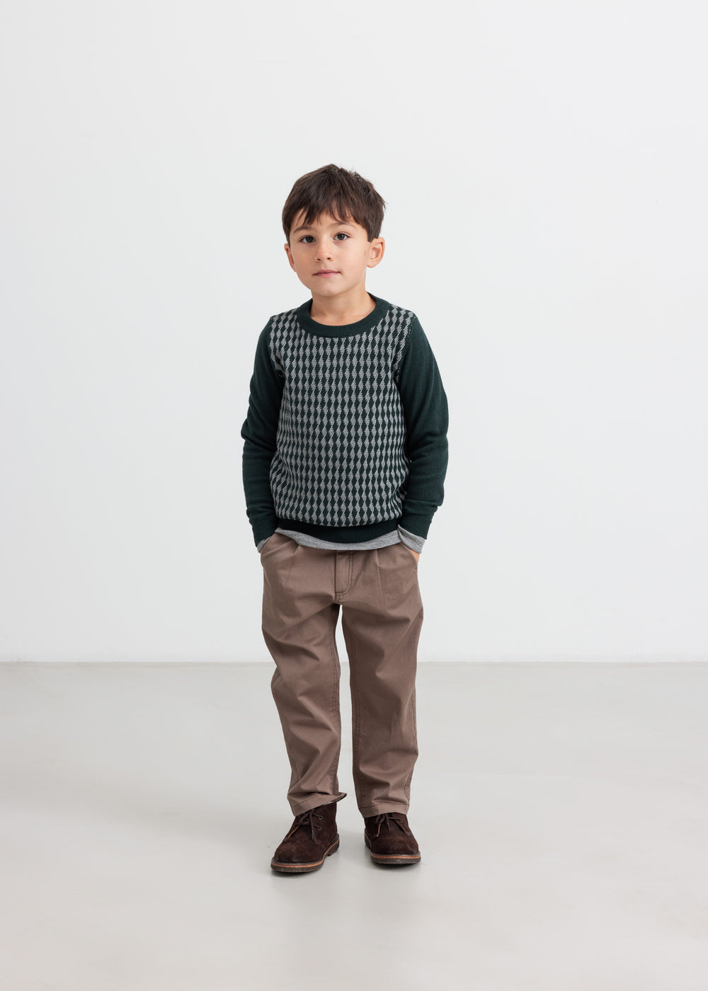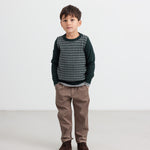 Dreng iført stribet trøje og kaki bukser