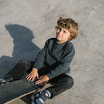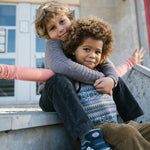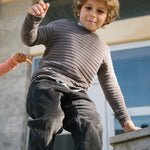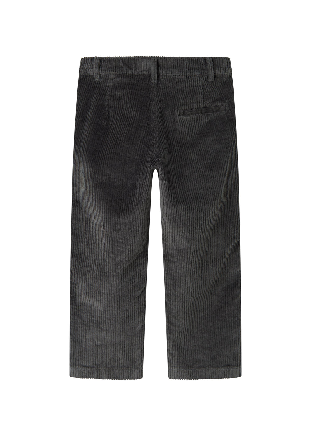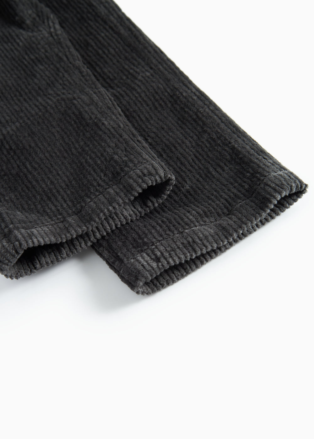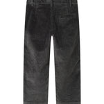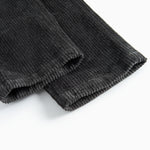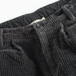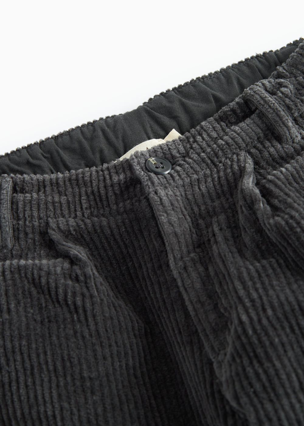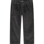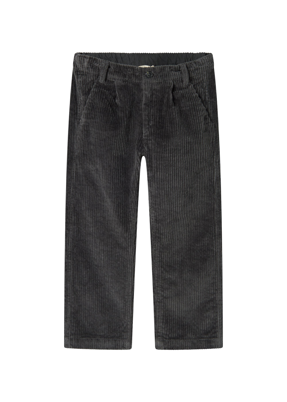 Corduroy trousers with three pockets and a wide elastic waistband that can be adjusted inside. The trousers close with a button and zipper.