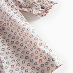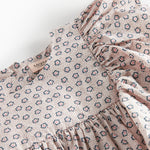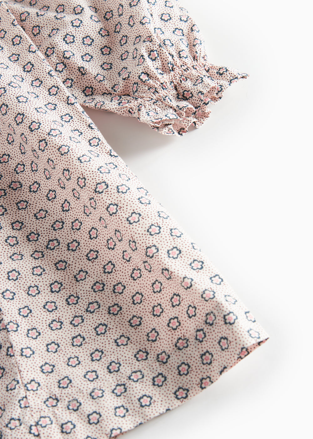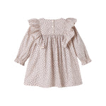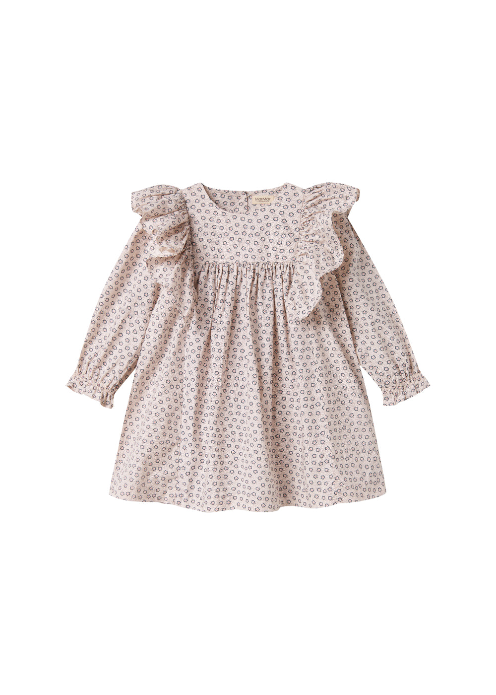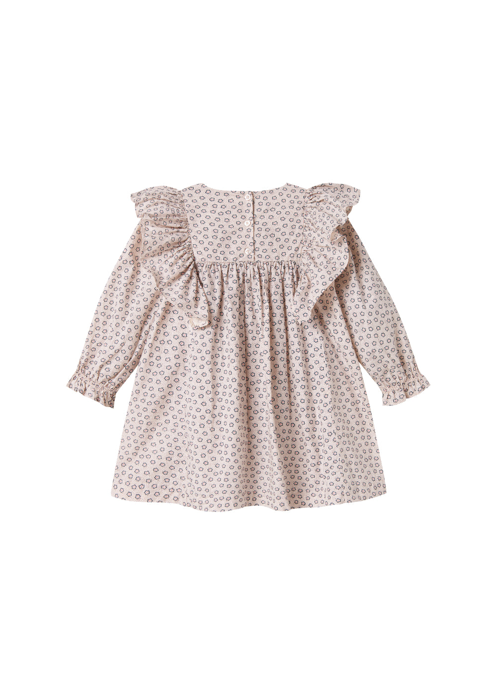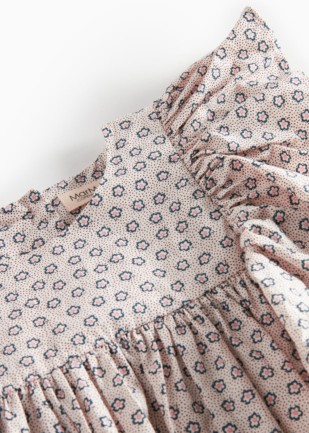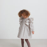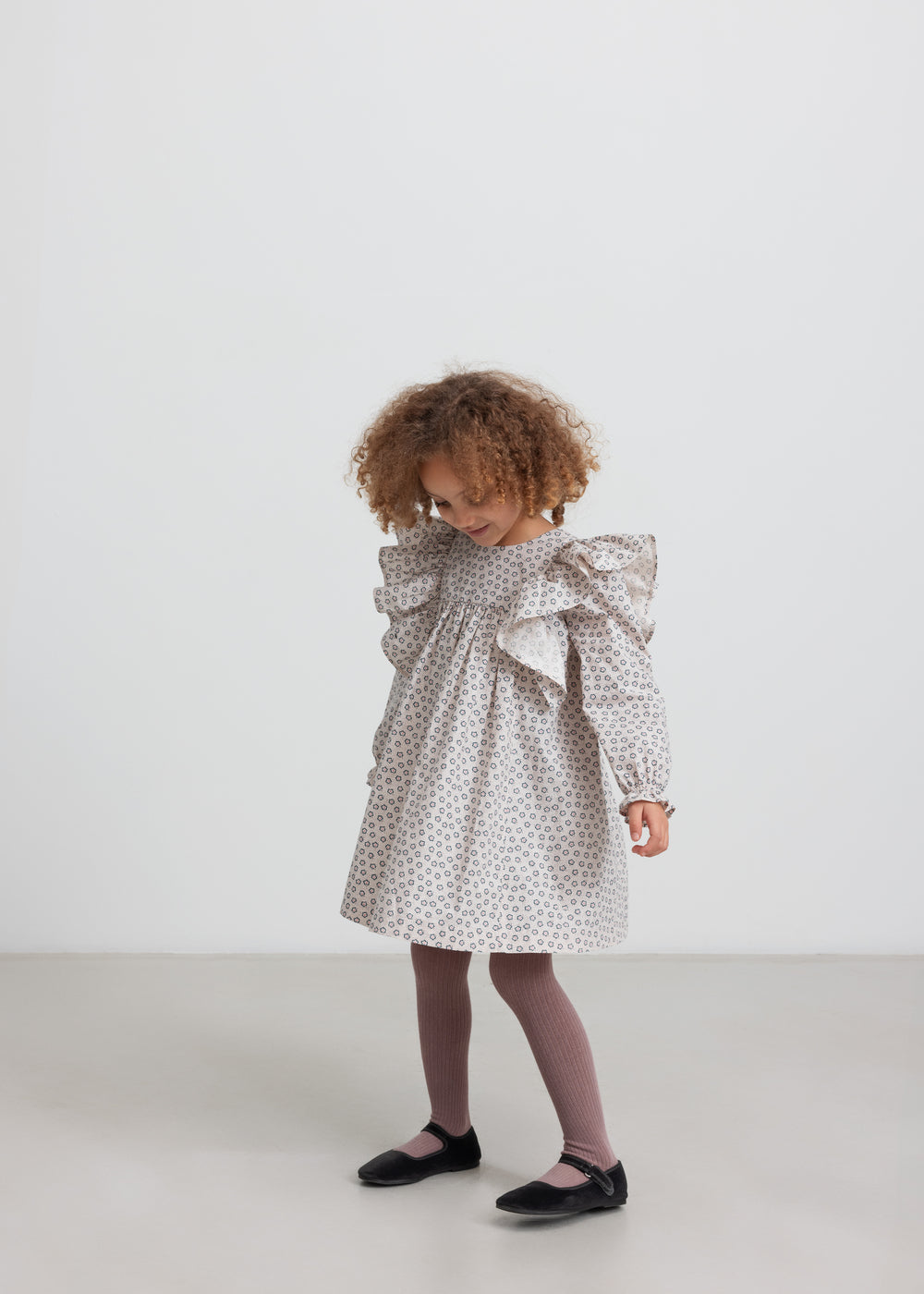 Long-sleeved and loose-fitting dress for children with a hand-drawn floral print and fine ruffle details. The dress has a button closure at the back and the length of the dress goes above the knees. The dress is both comfortable, light and airy to wear.