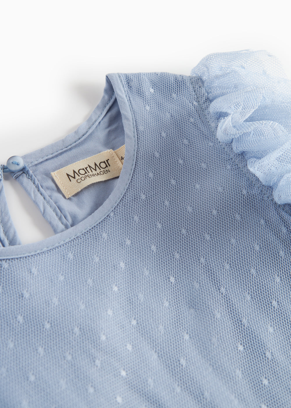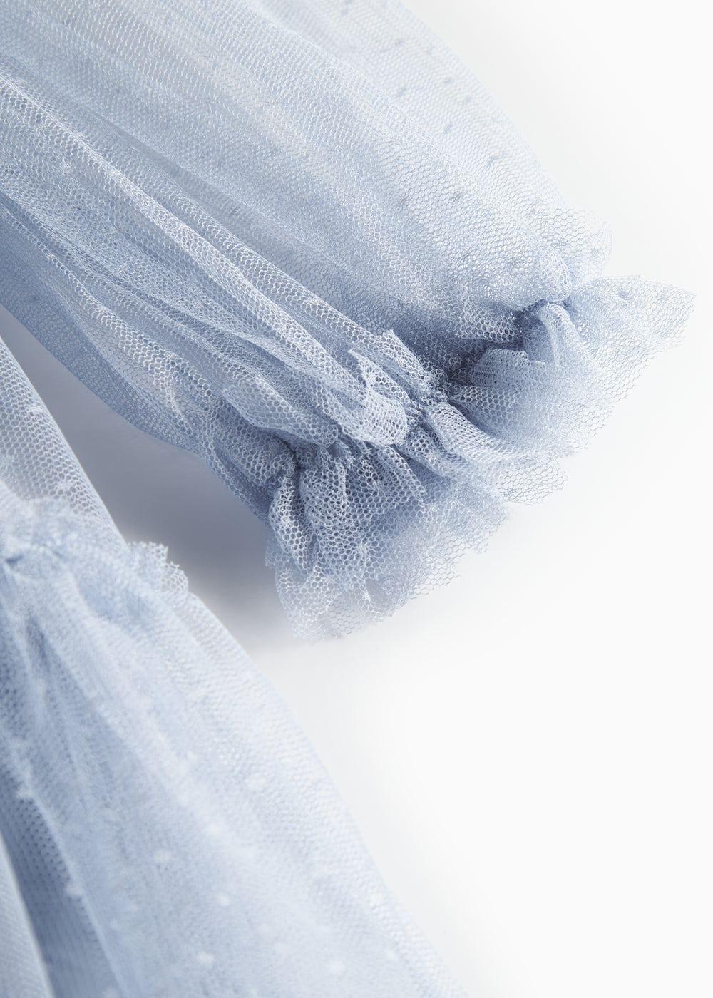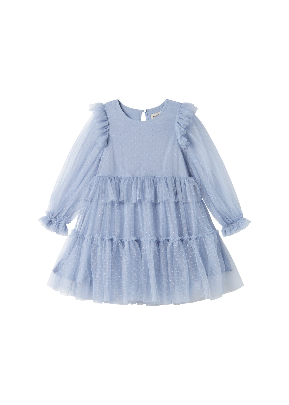 Long-sleeved dress for children with lots of volume and beautiful tulle ruffles. The dress is decorated with dots and has a button closure at the back. The length of the dress goes above the knee.