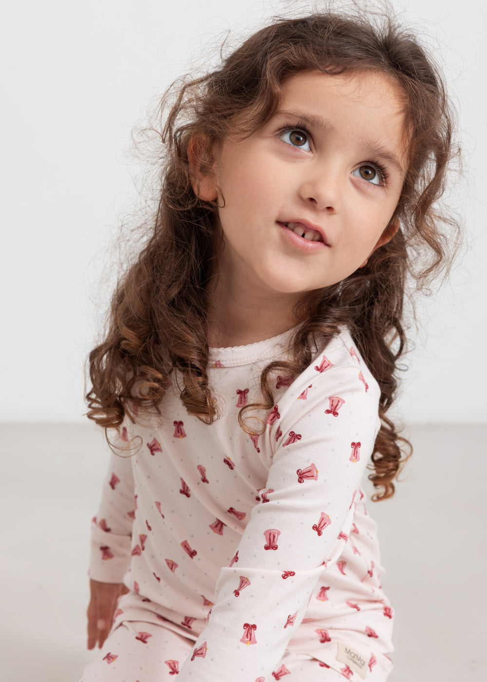 Simple and comfortable sleepwear set for children. The sleepwear has a nice print and picot edges and is both soft, stretchy and comfortable to wear.