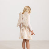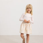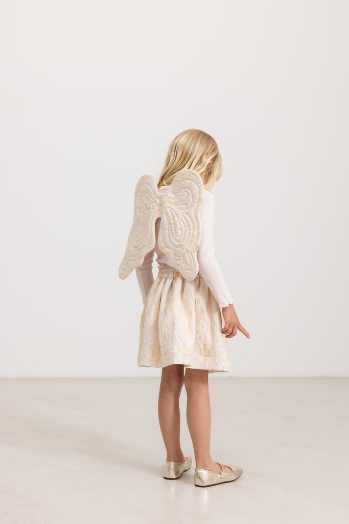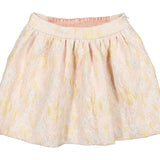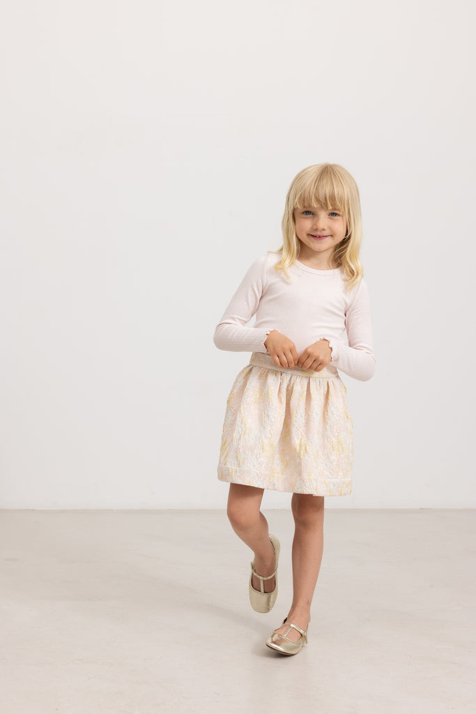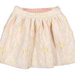 Skirt with lots of volume. The skirt has elastic at the waist and closes with a zipper on the right side. The length of the skirt goes above the knee.