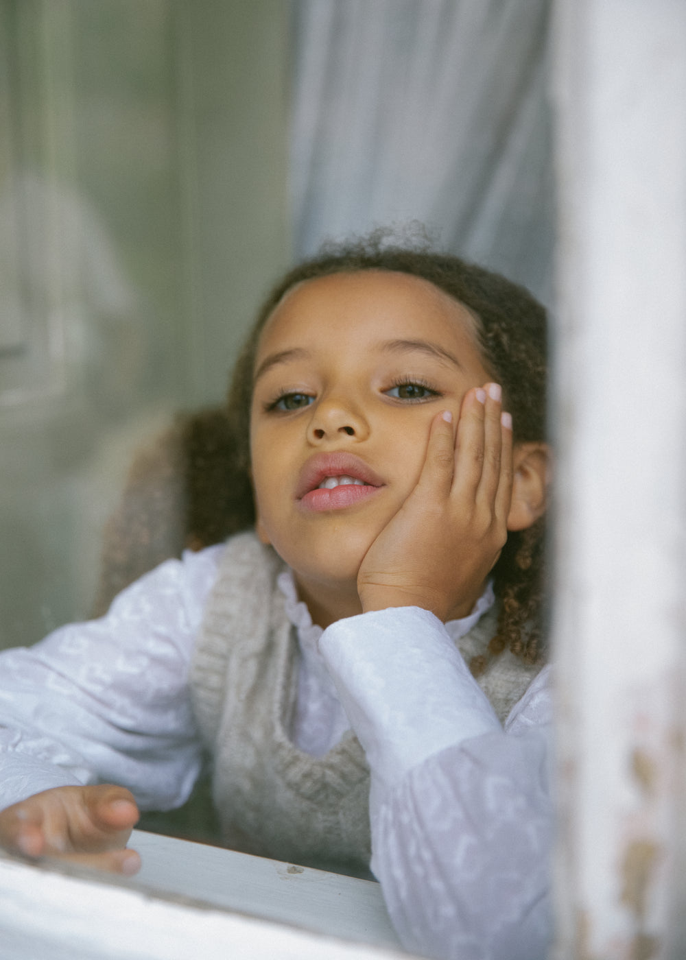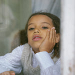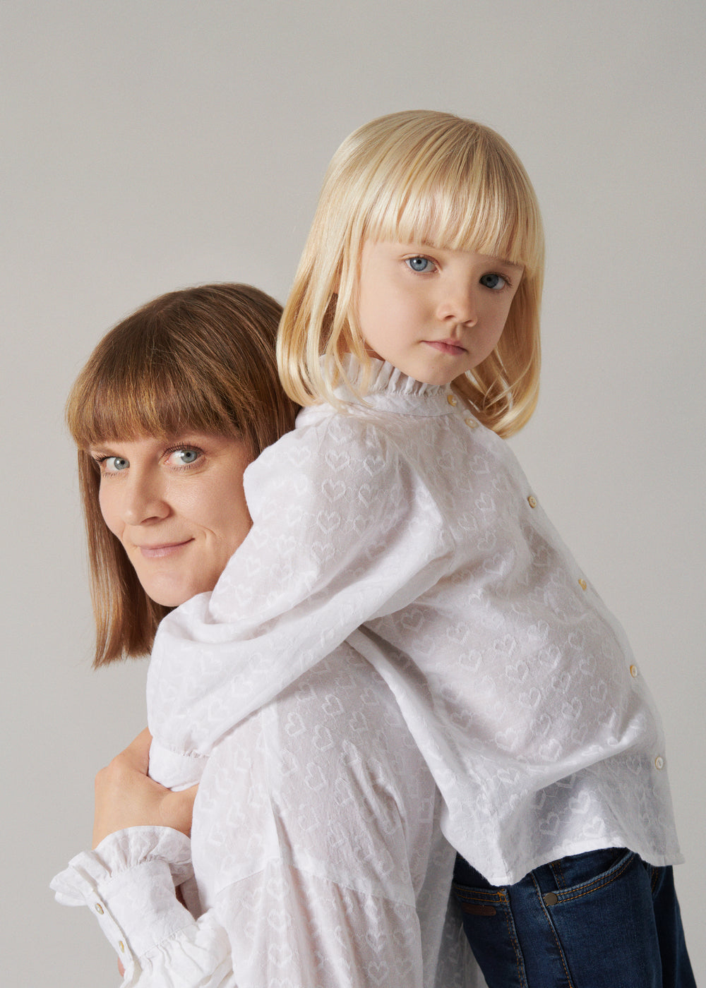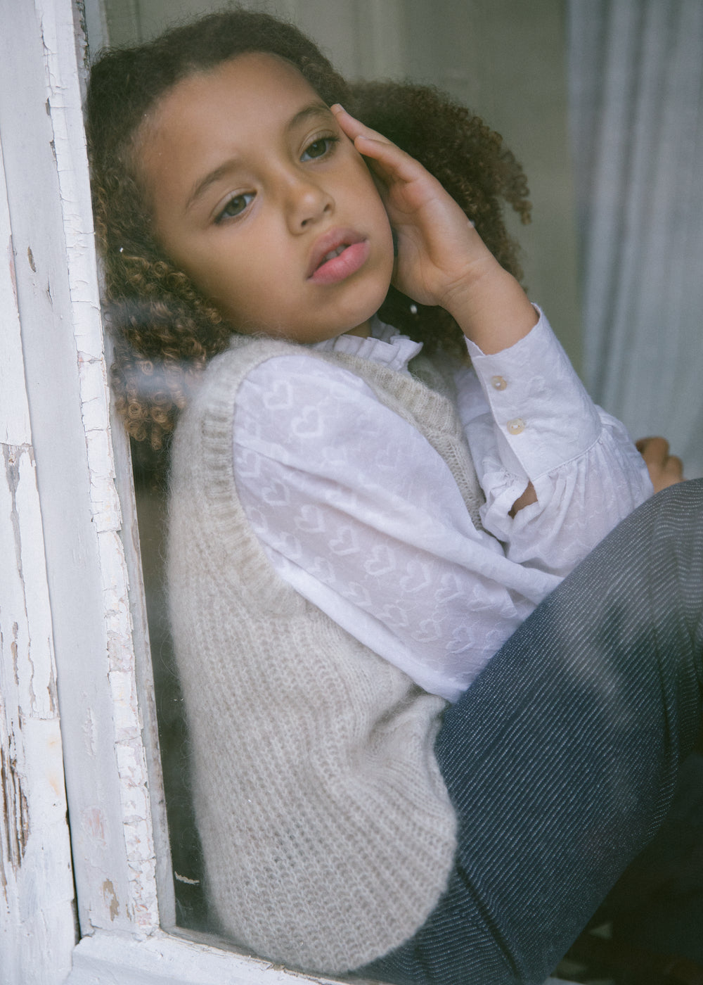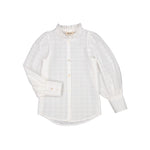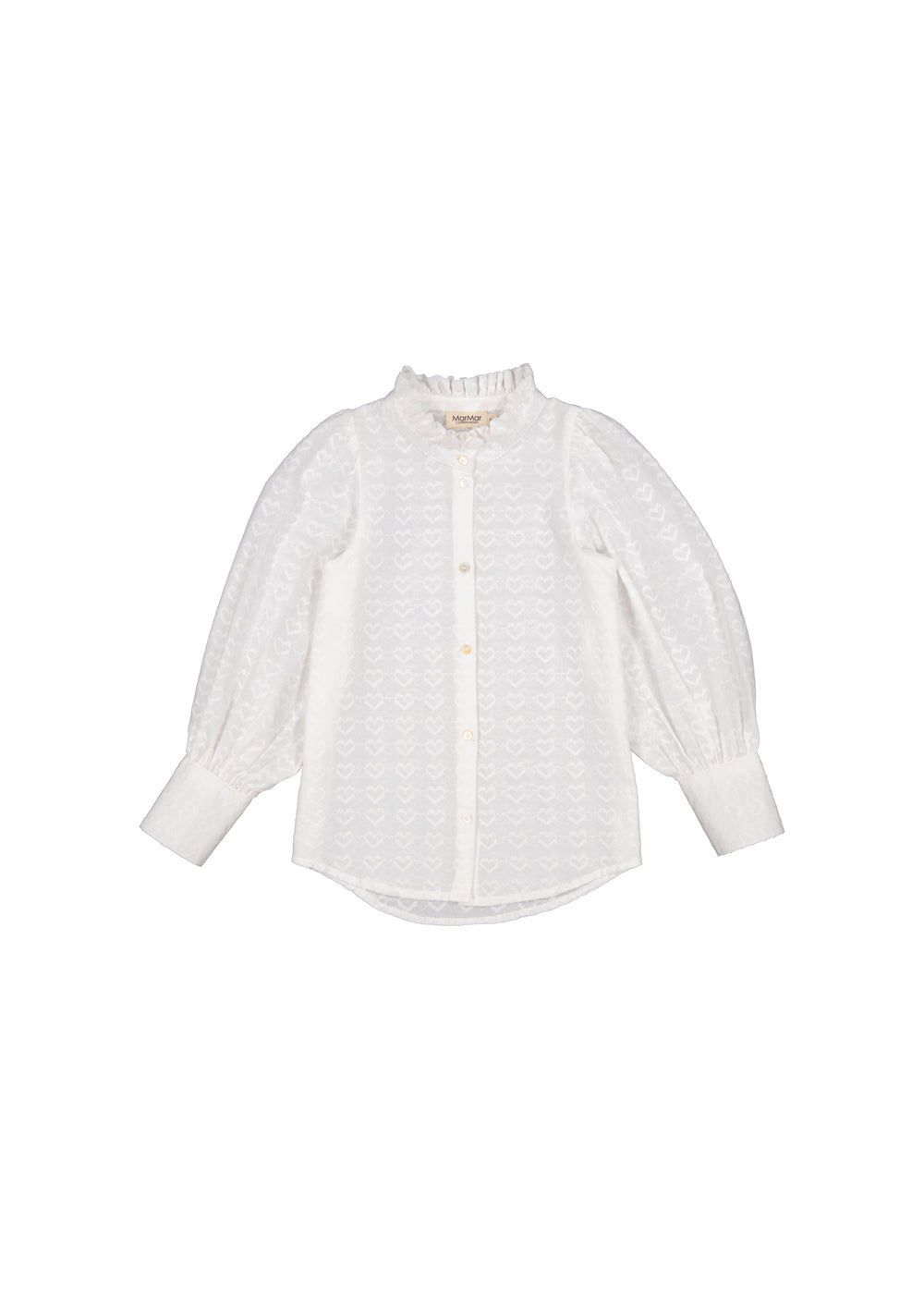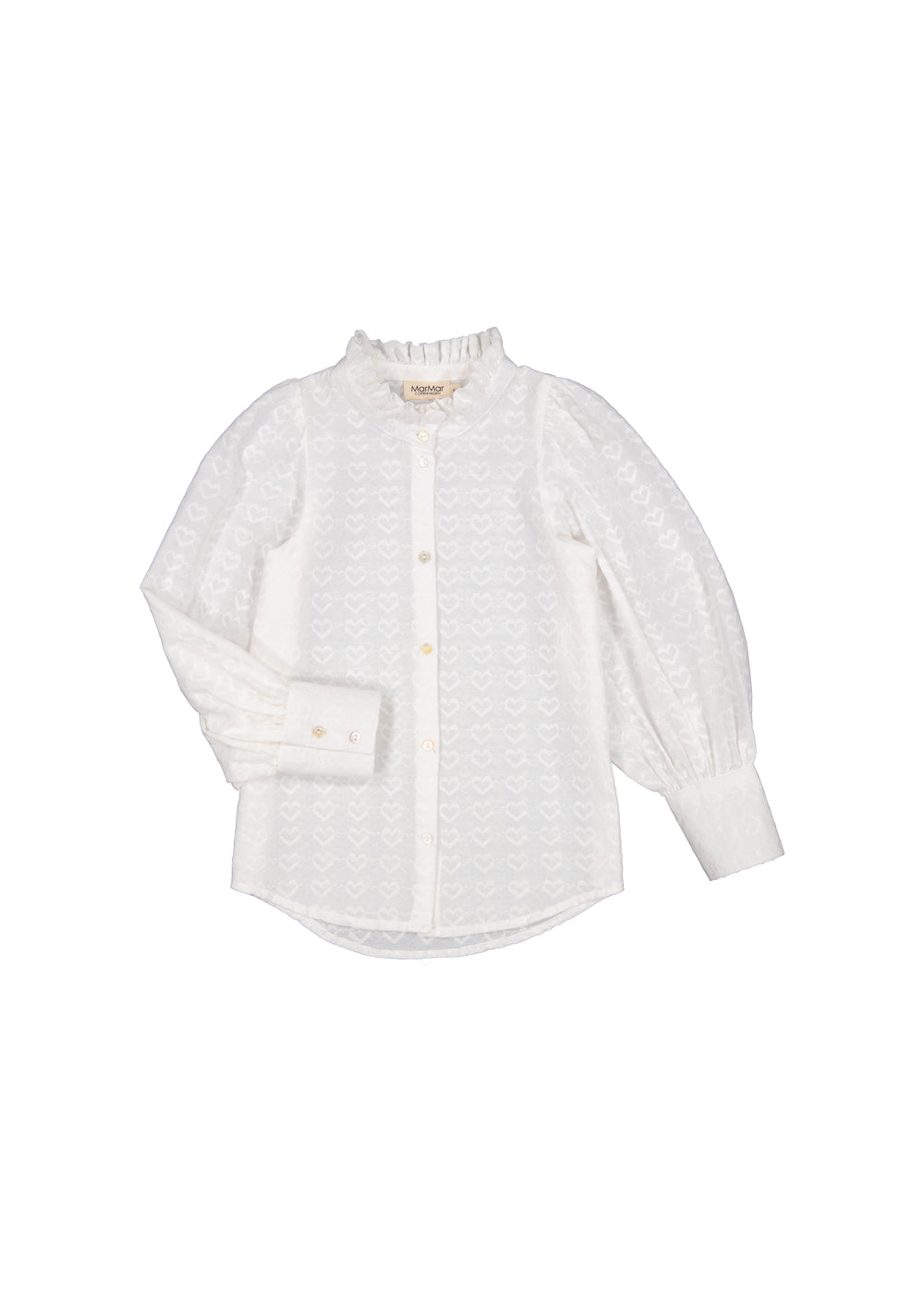 Shirt for children with fine heart embroidery, high ruffle collar, voluminous sleeves and buttons at the front