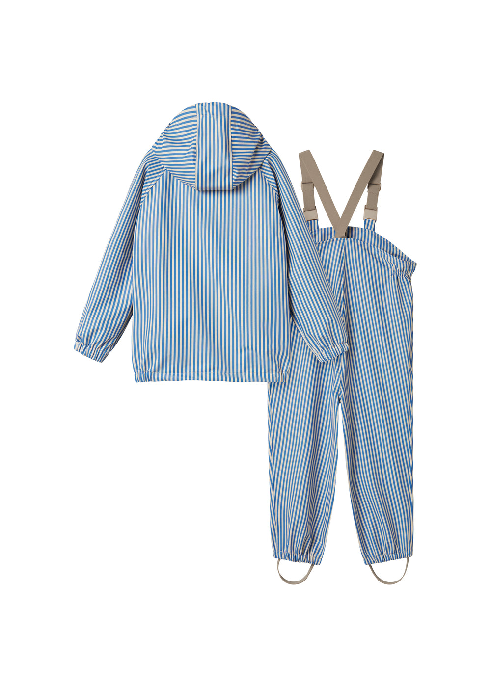 Blå stribet regnjakke og regnbukser med hætte, seler og fodstropper til børn