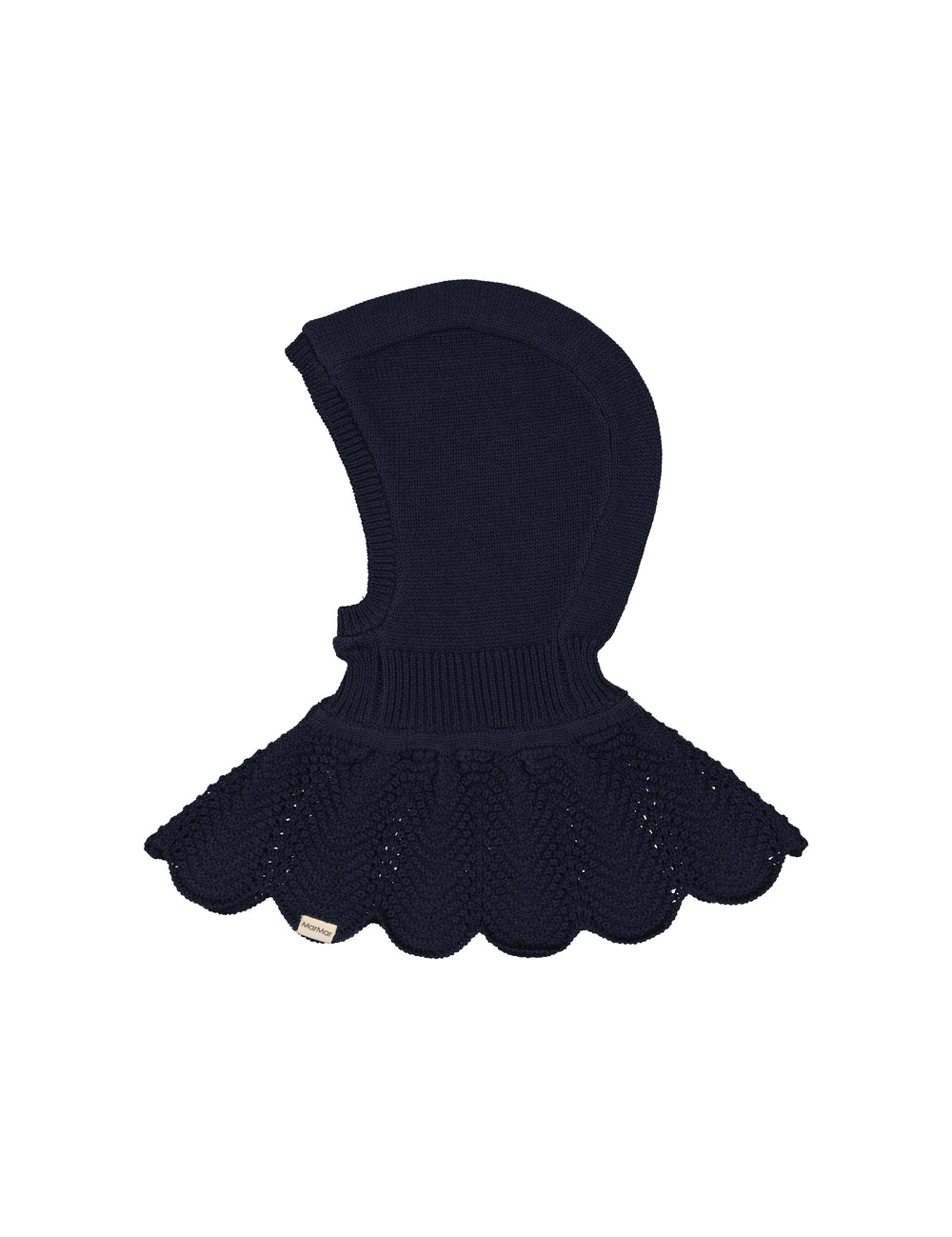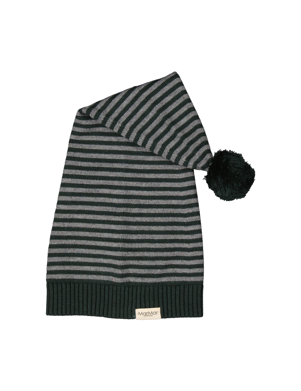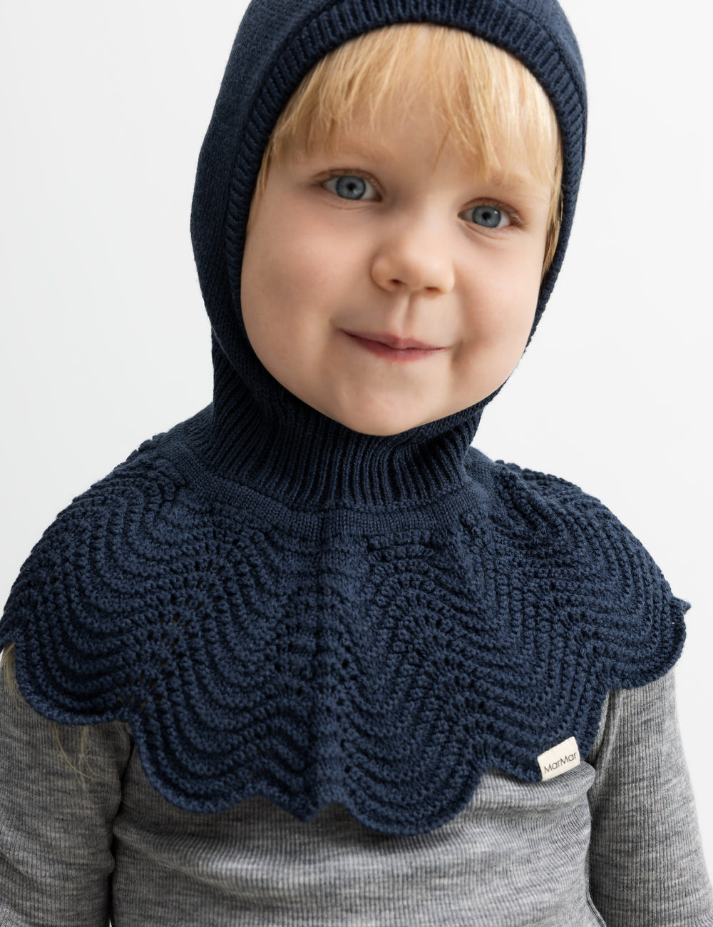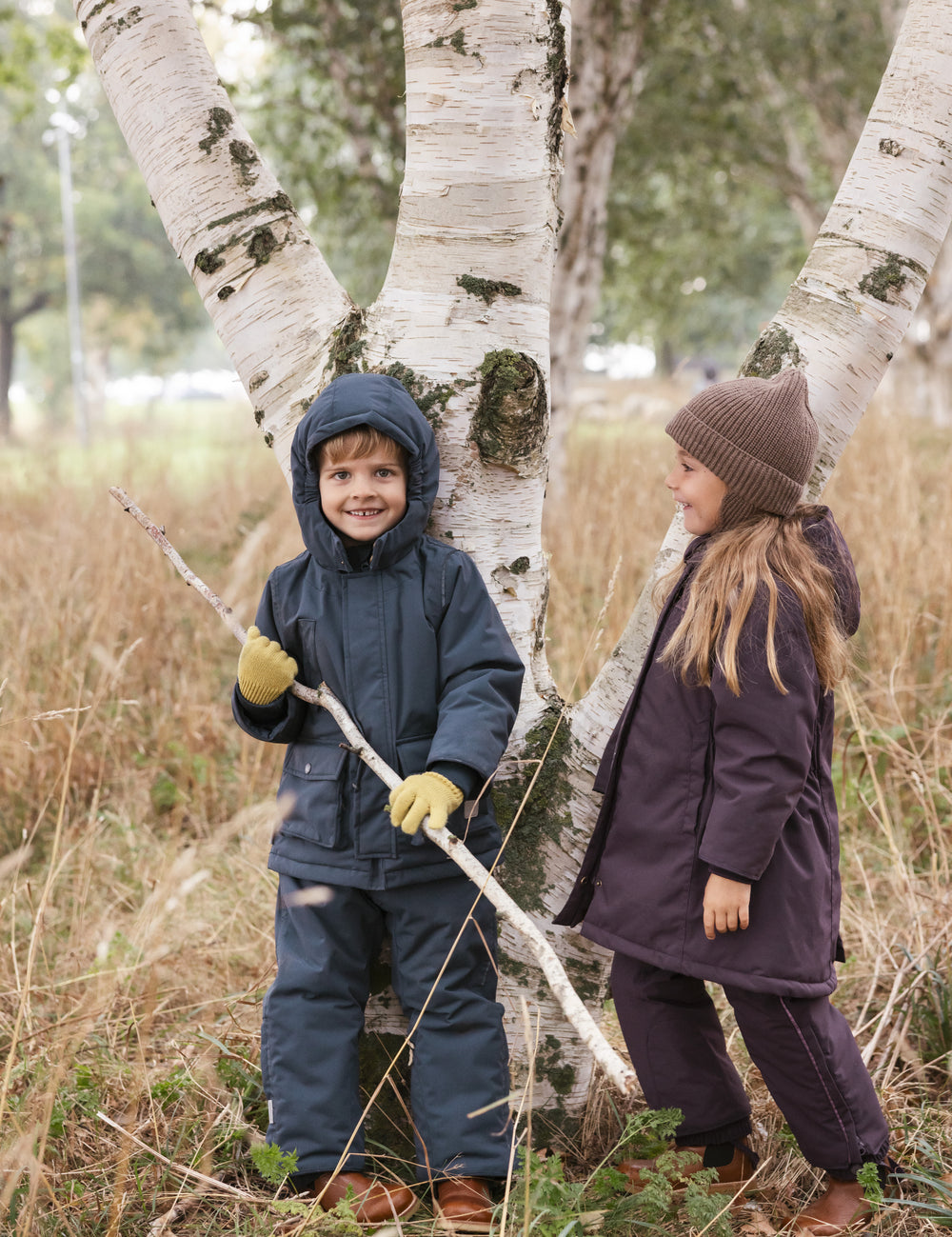 Baby iført beige strikhue og mørkegrøn heldragt, står og kigger til siden.