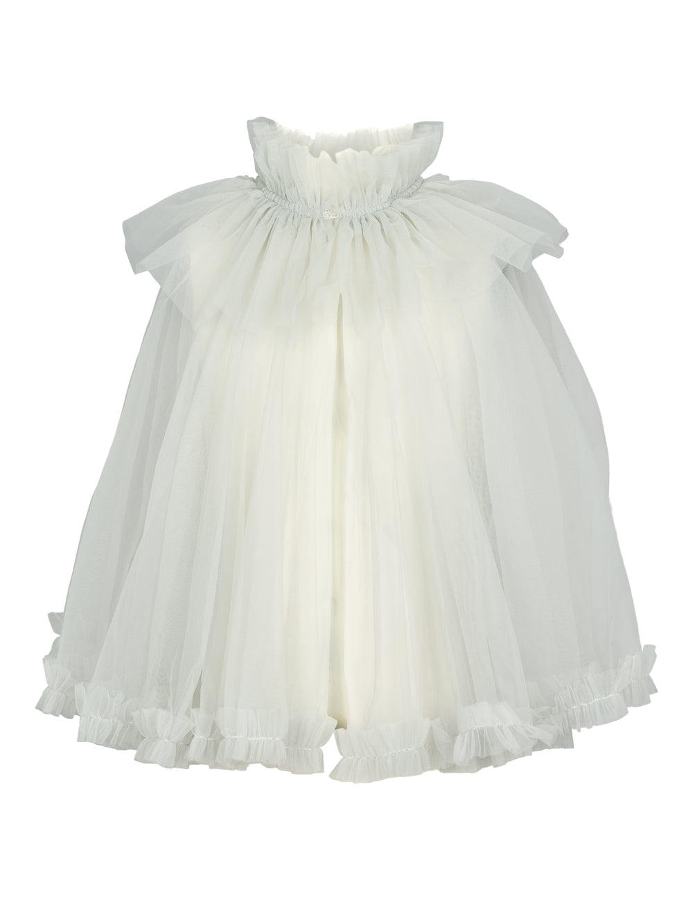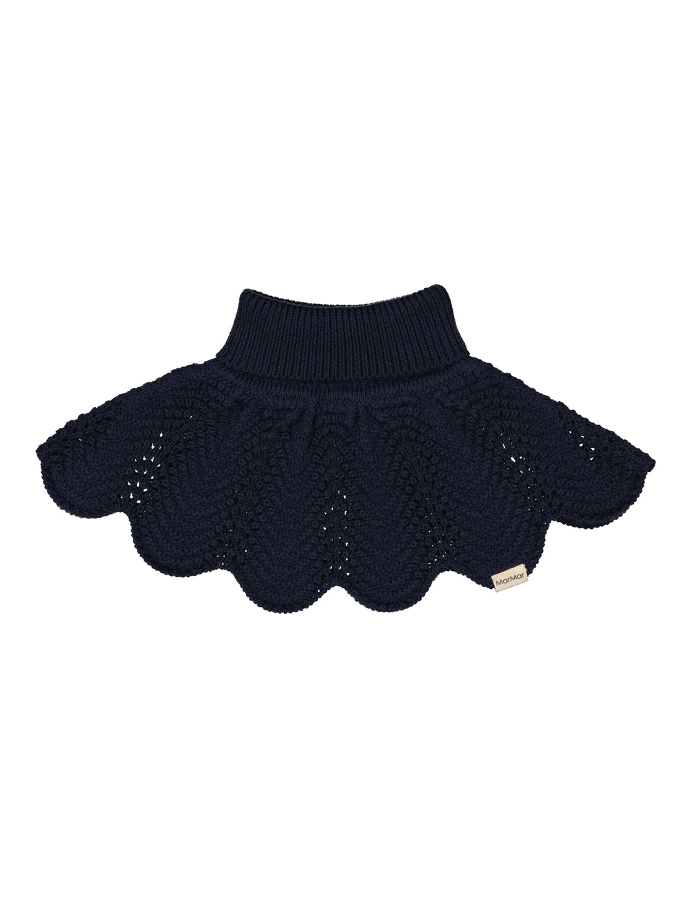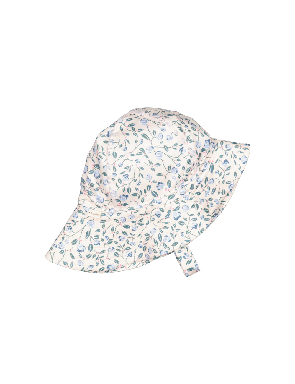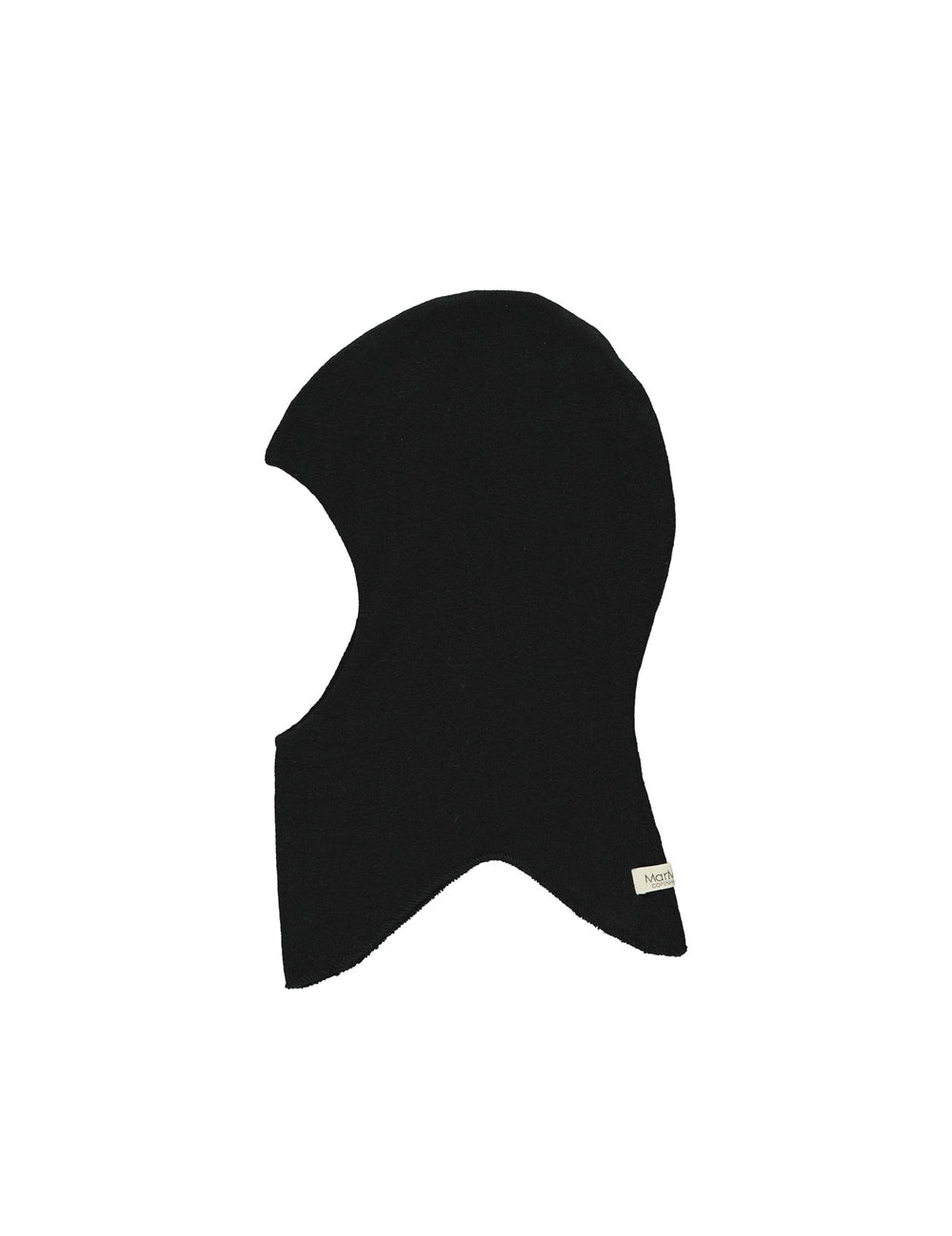 Baby iført beige strikhue og mørkegrøn heldragt, står og kigger til siden.