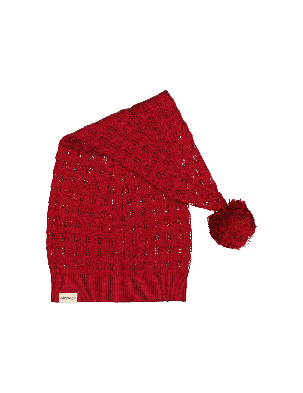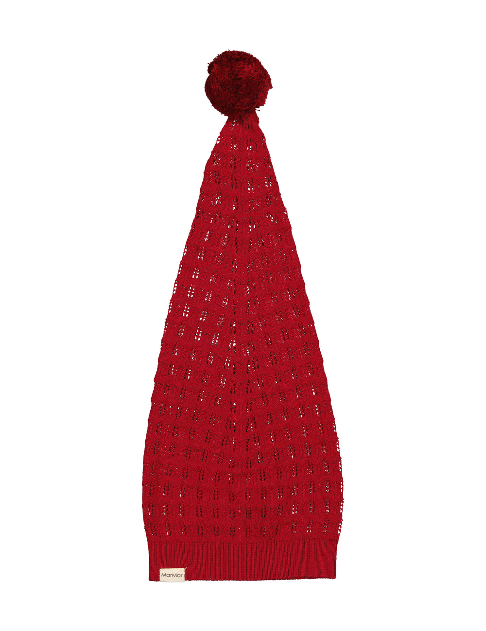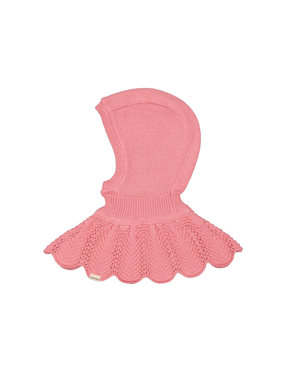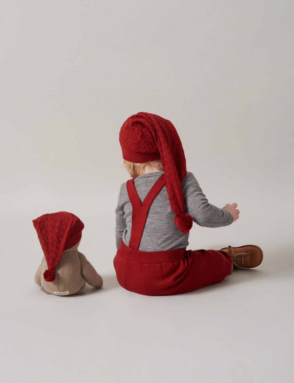 Baby i rosa kjole med blå strikket beret og rød kvast