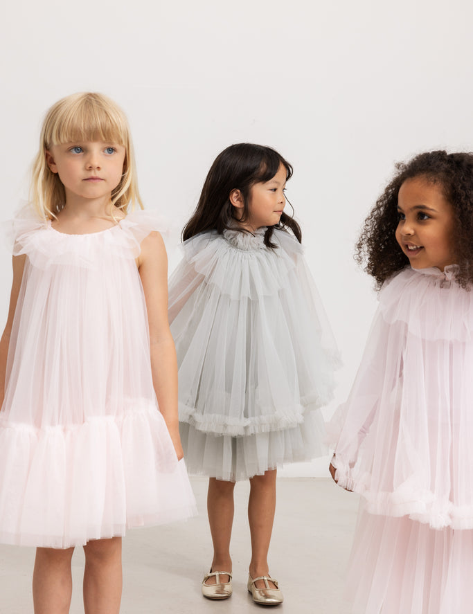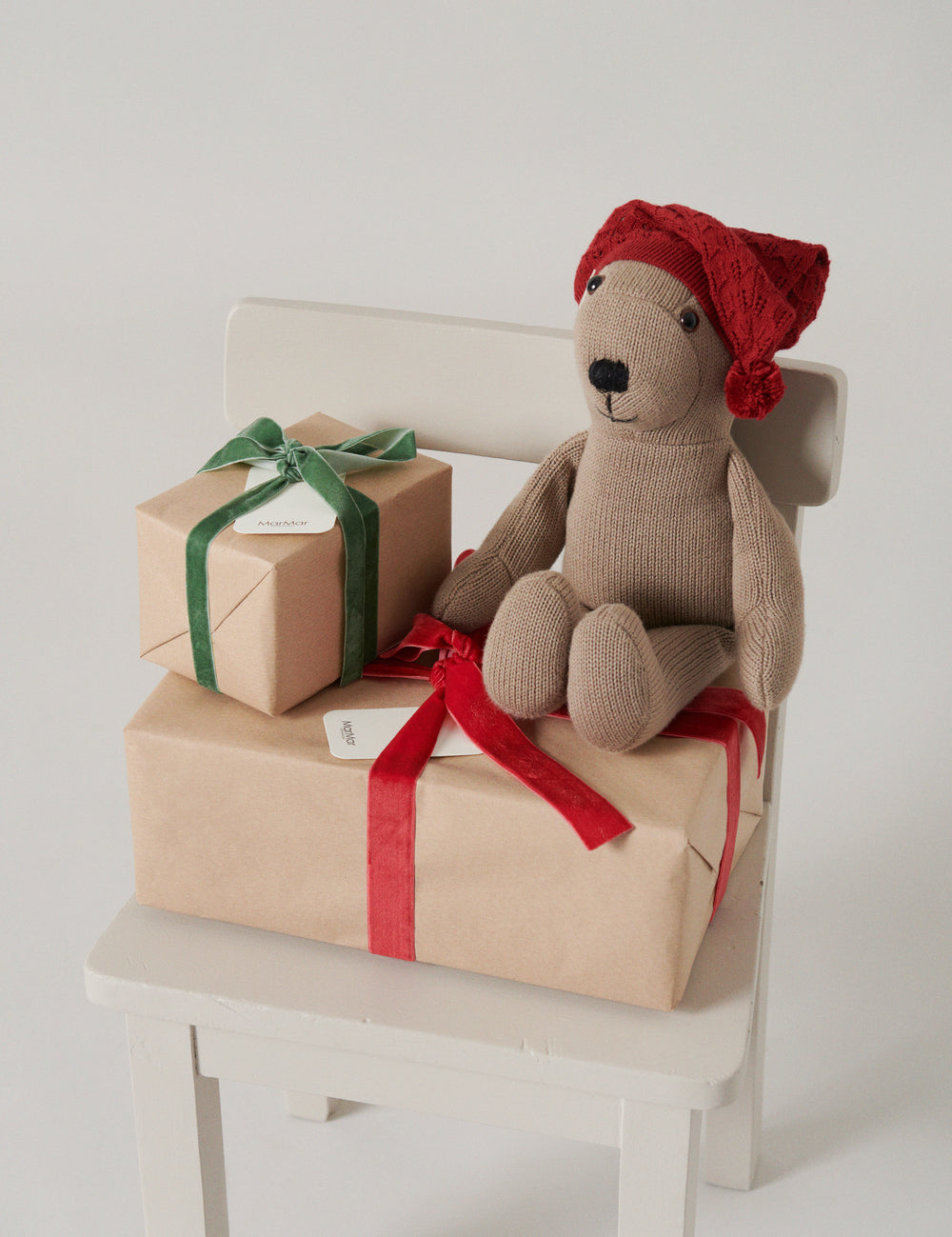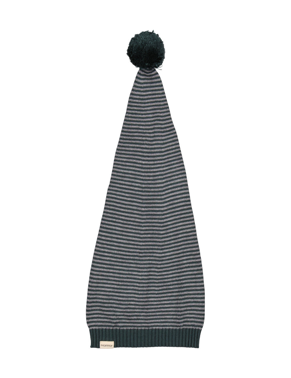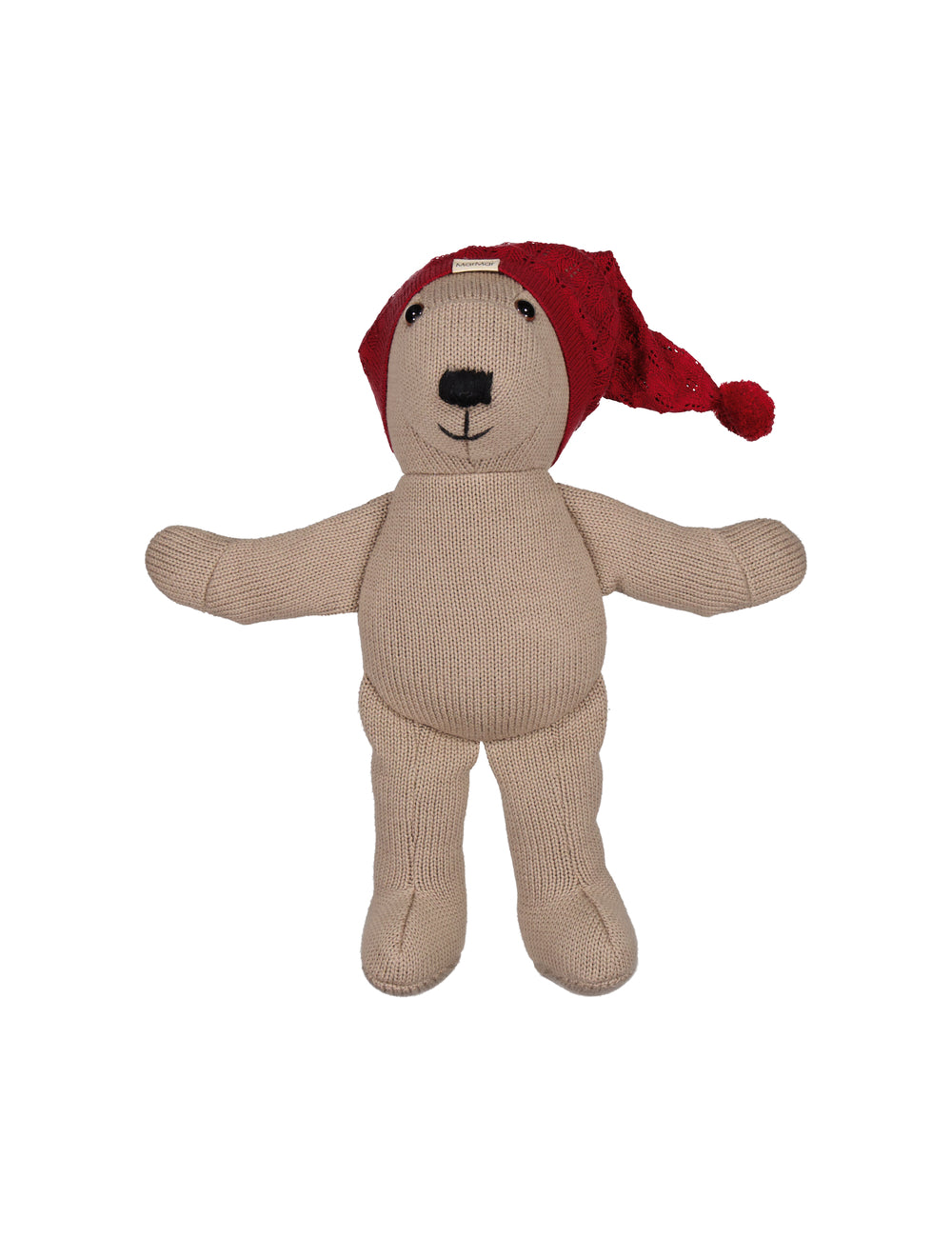 Baby i rosa kjole med blå strikket beret og rød kvast