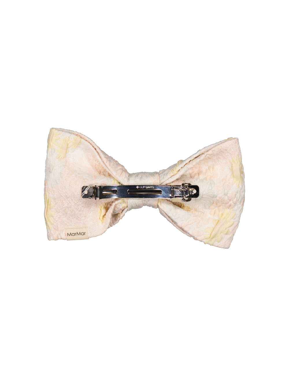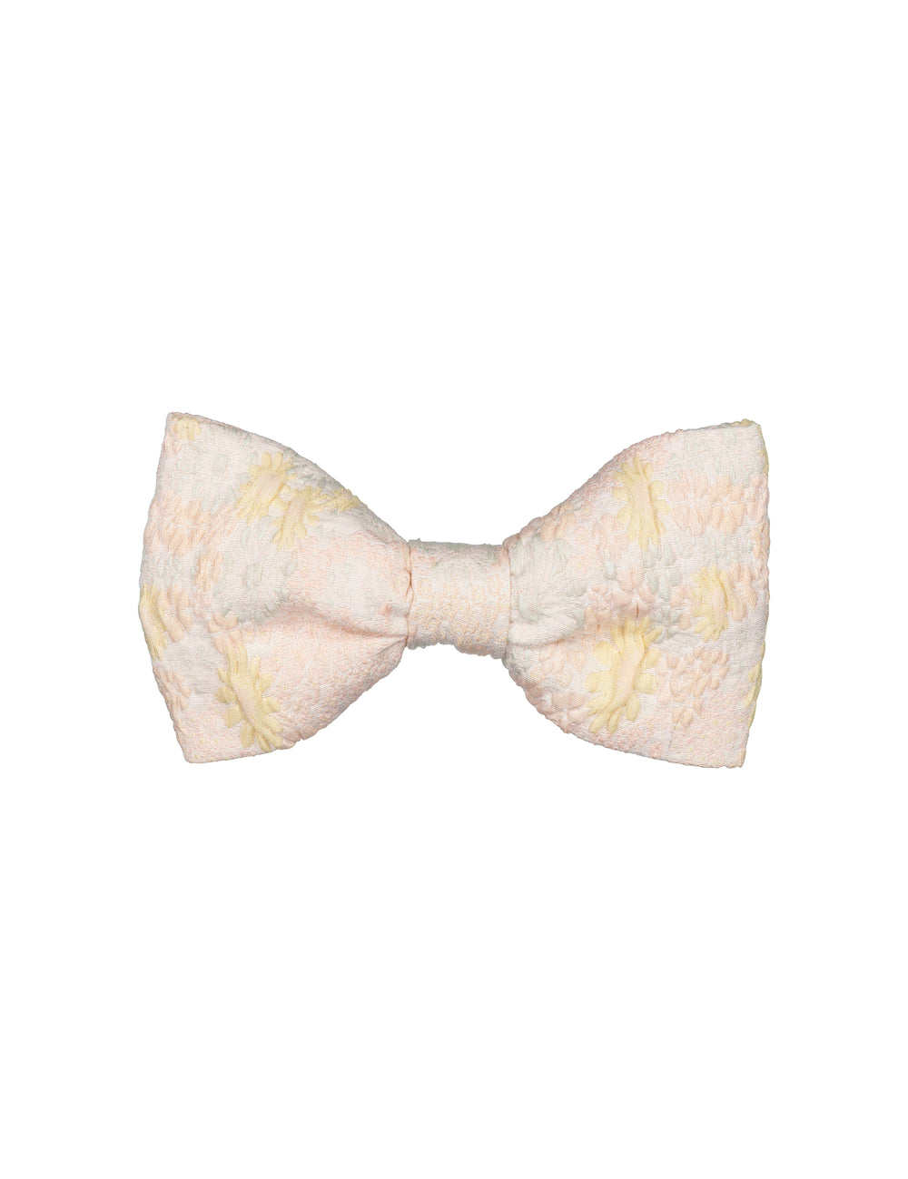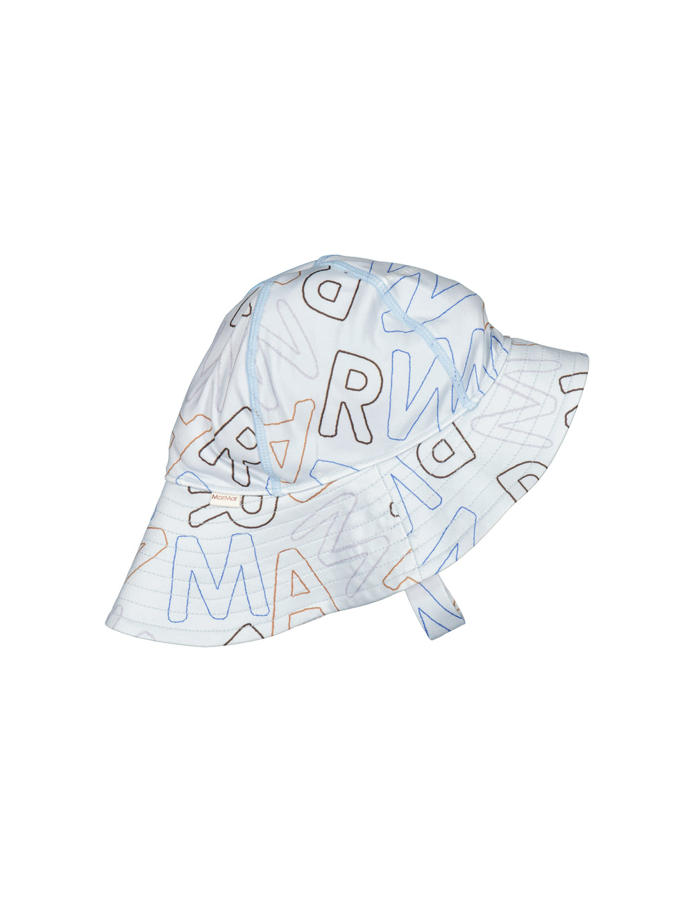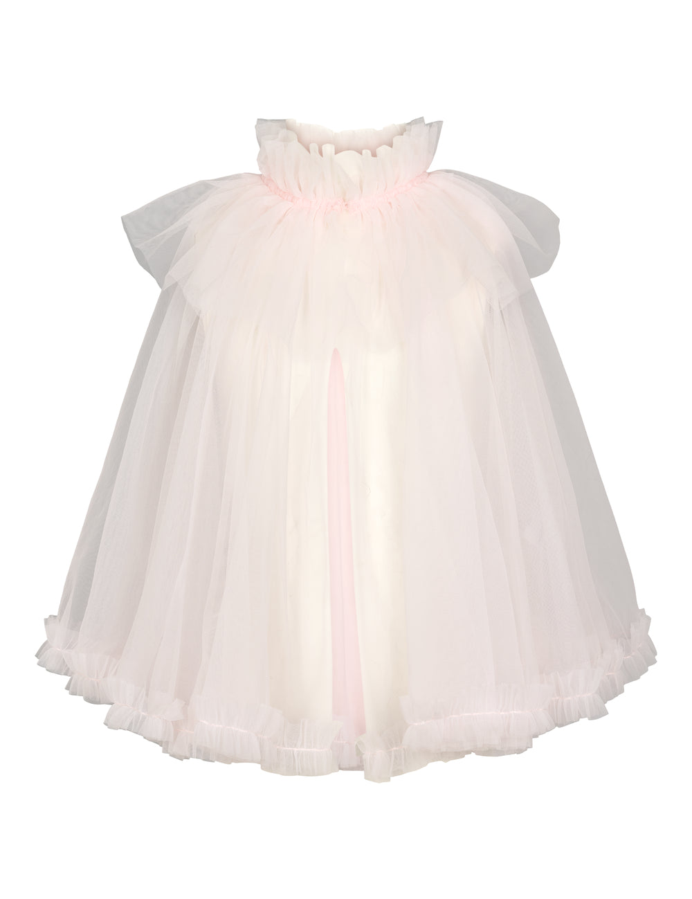 Baby i rosa kjole med blå strikket beret og rød kvast