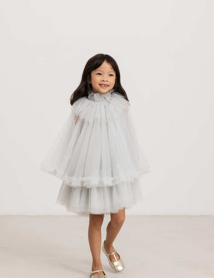 Pige bagfra med blå beret med rød kvast og brun frakke