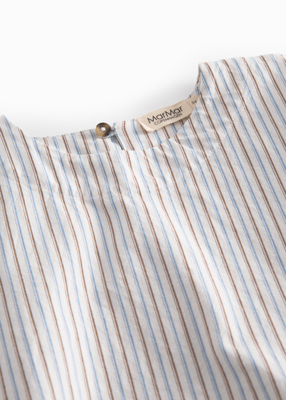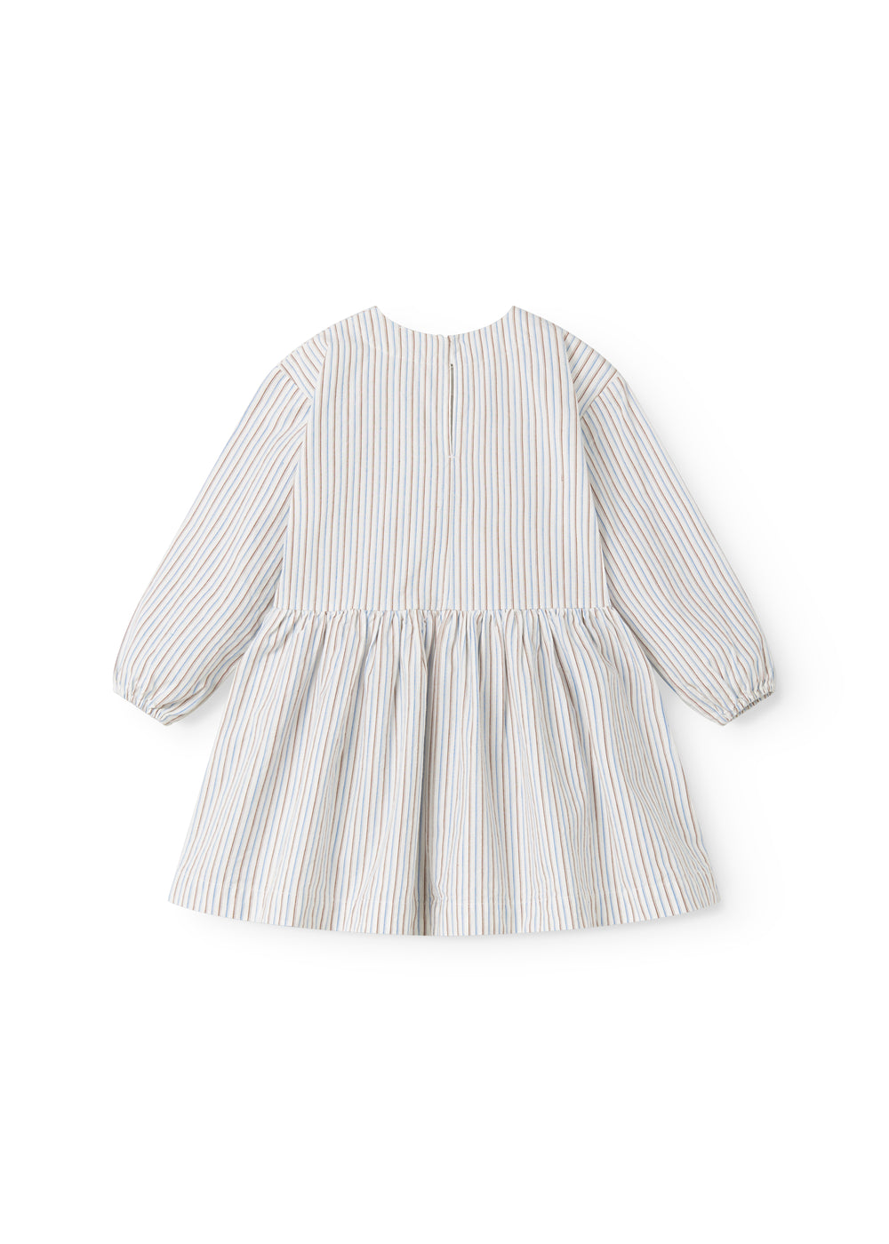 Long-sleeved striped dress for children with a loose fit. The dress has two pockets at the front and a button closure at the back. The length of the dress goes above the knee. The dress has a roomy and comfortable fit and is soft to wear.