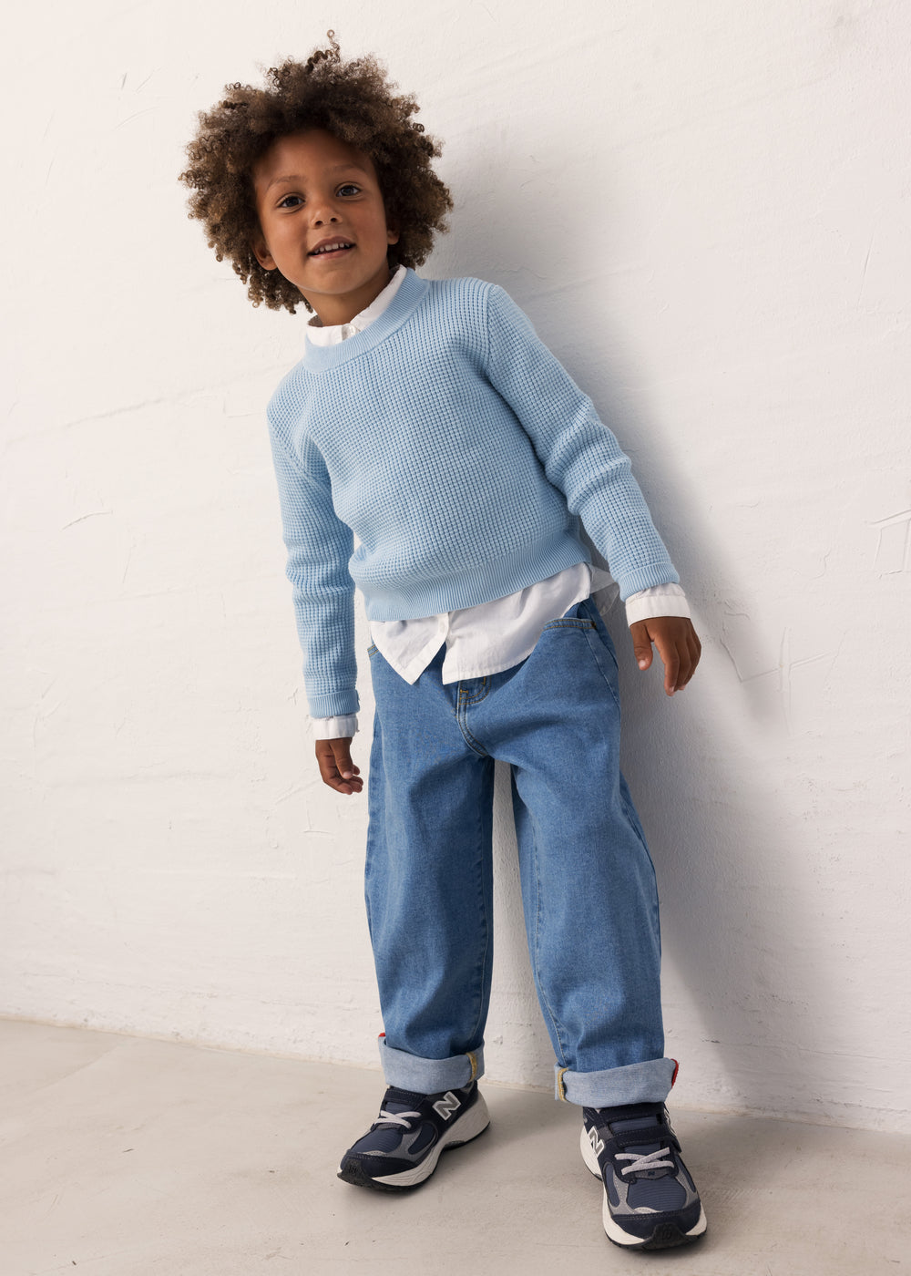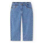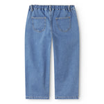 Classic jeans in a soft cotton denim, with 5 pockets and a slightly baggy fit. The jeans have a wide elastic waist that can be adjusted inside and closes with a button and zipper.