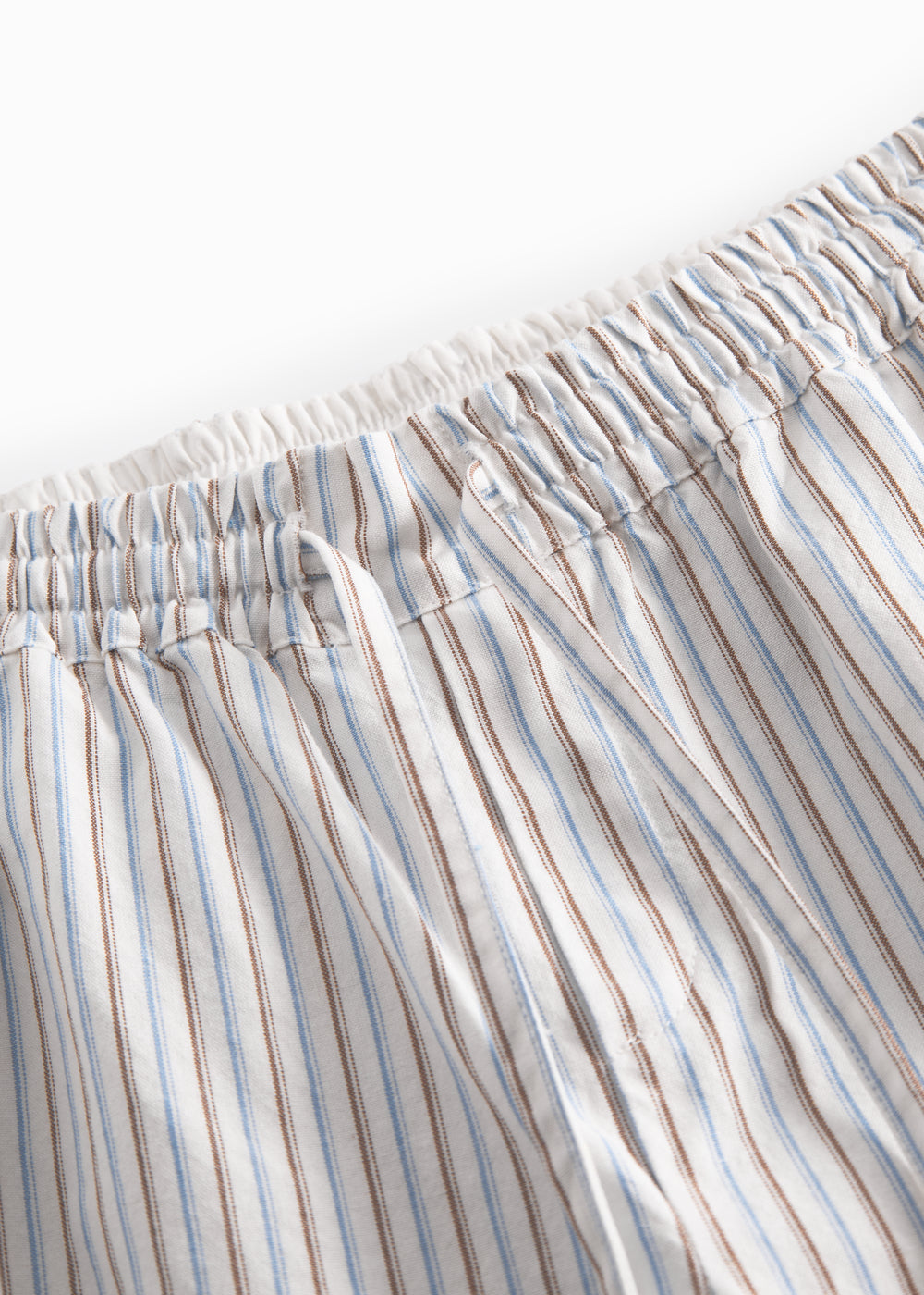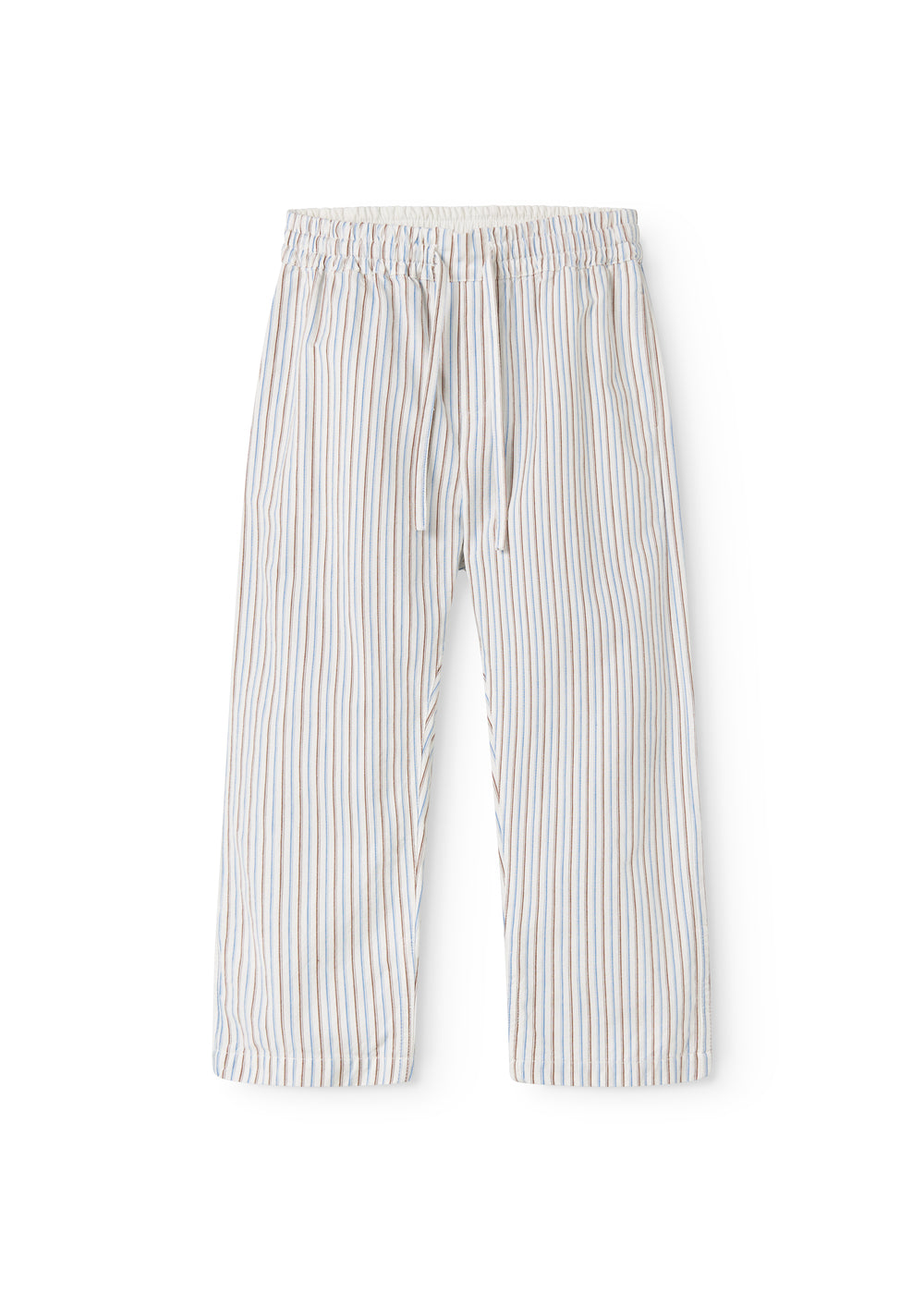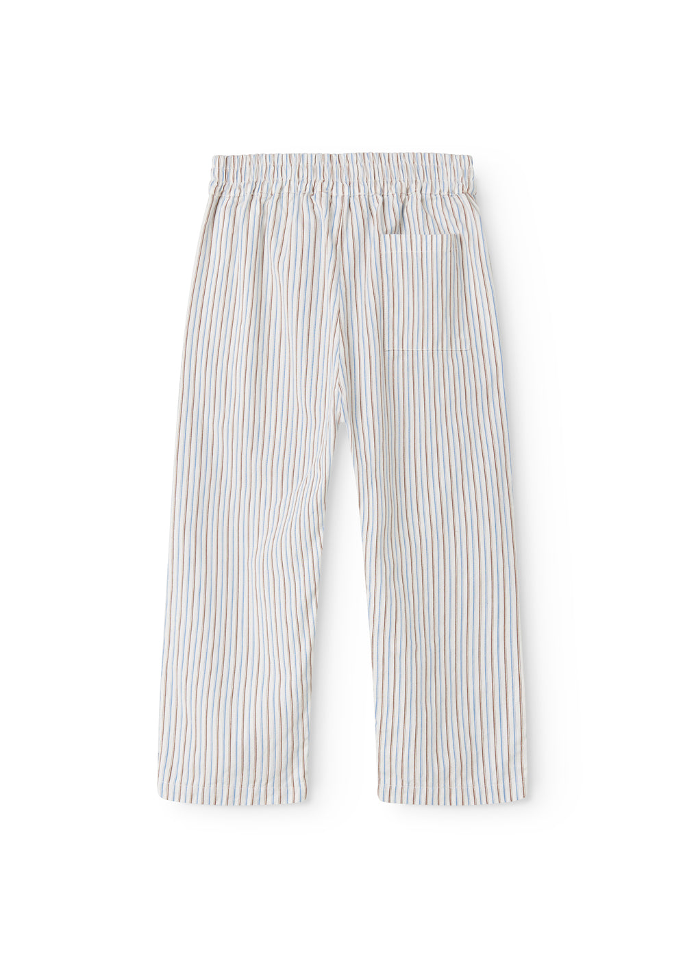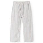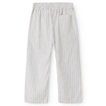 Striped loose-fitting trousers for children with elastic and drawstring waist and a pocket on the back. The trousers have a comfortable fit and are soft to wear.