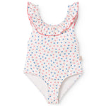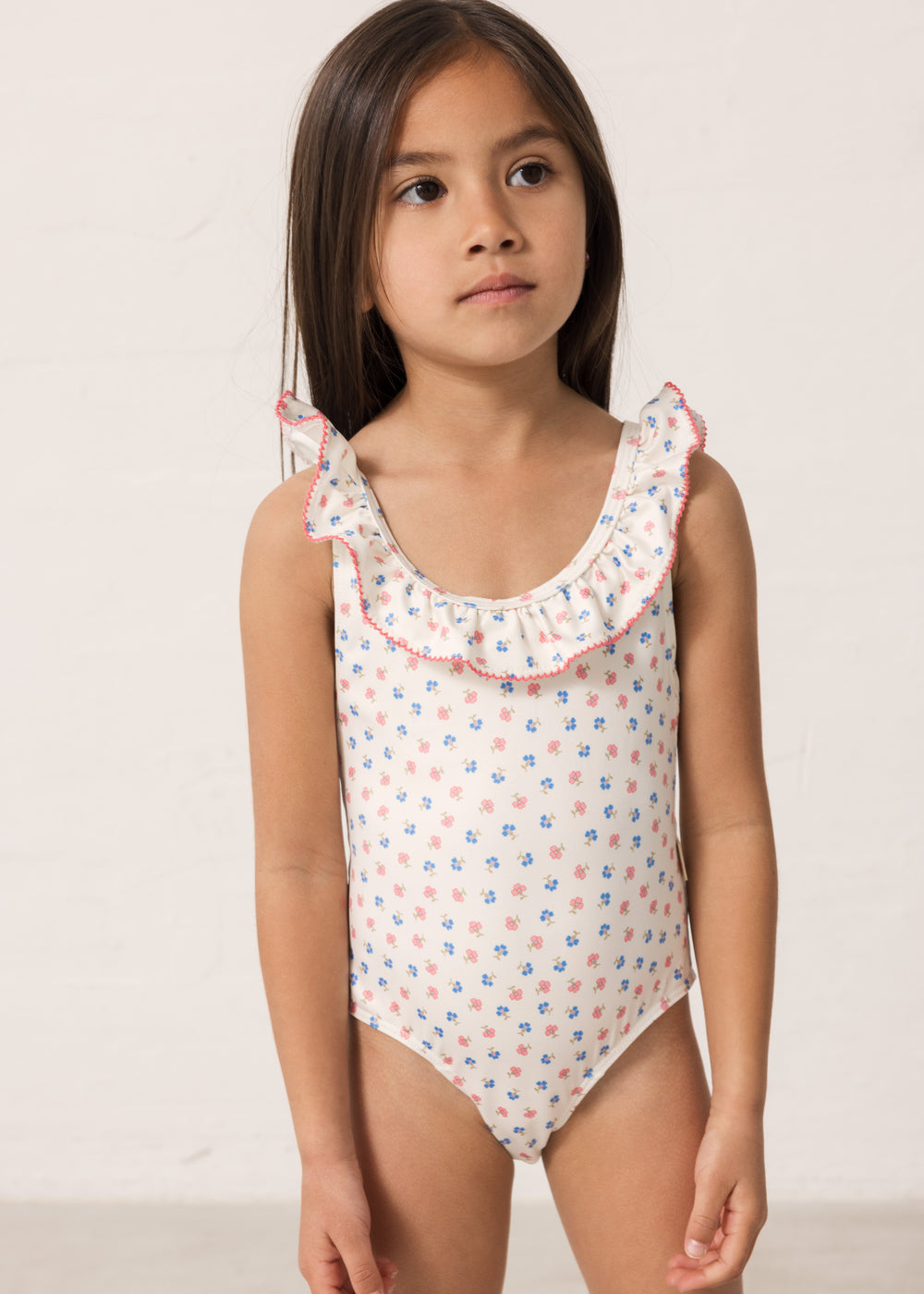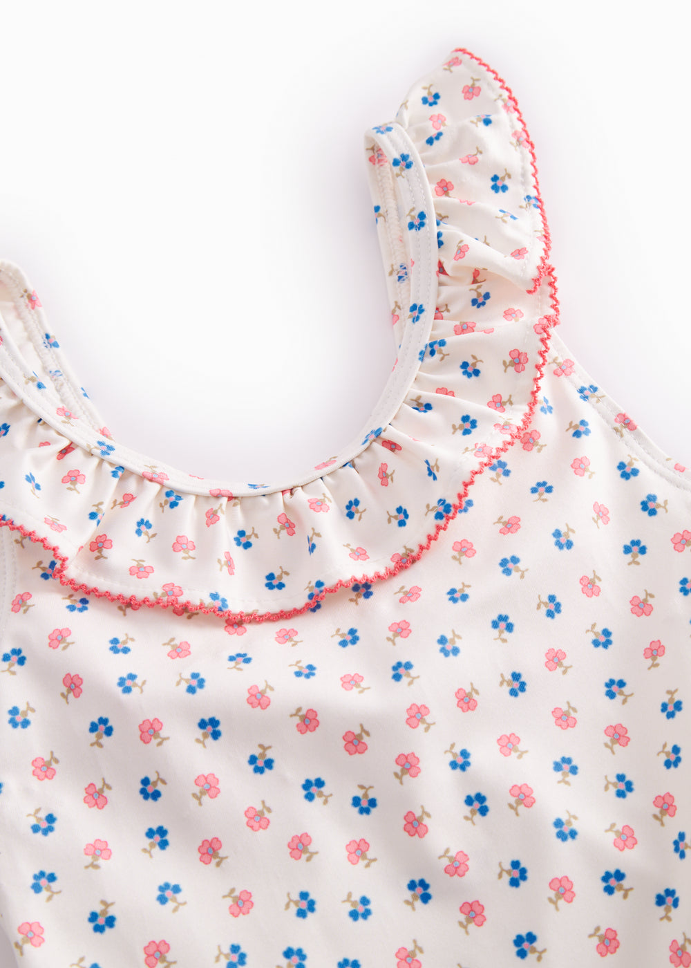Swimsuit for children with a collar and fine ruffle details and picot edges. The swimsuit has a nice floral print.