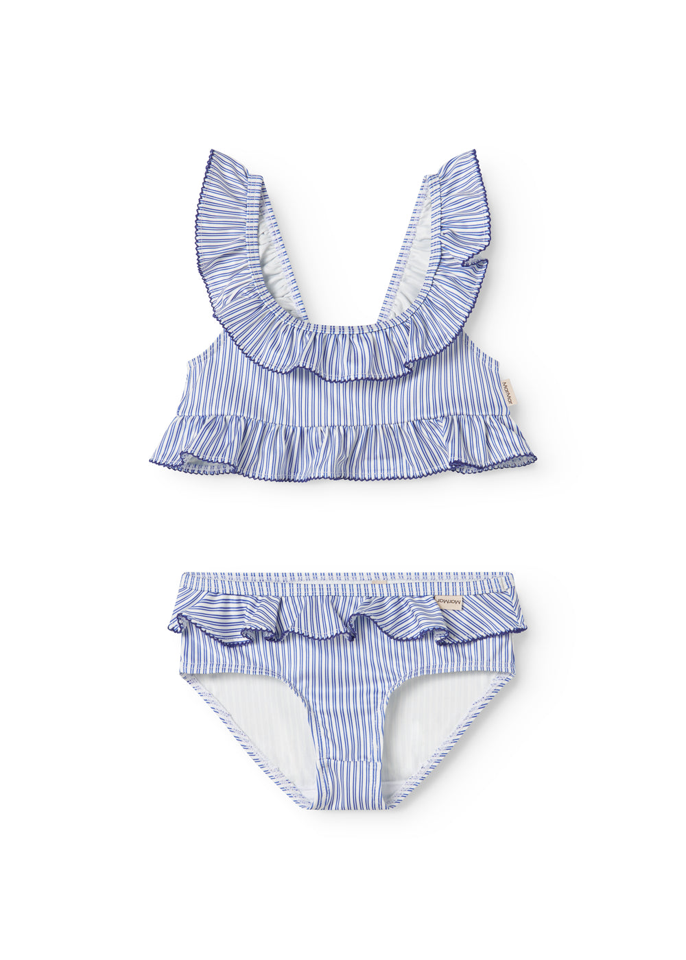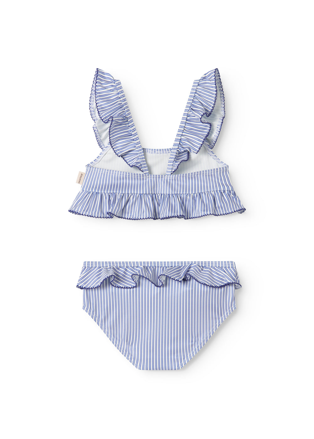 Bikini with top and bottom. The bikini has nice ruffle details and picot edges on both the top and bottom. The bikini has nice stripes and is comfortable to wear.