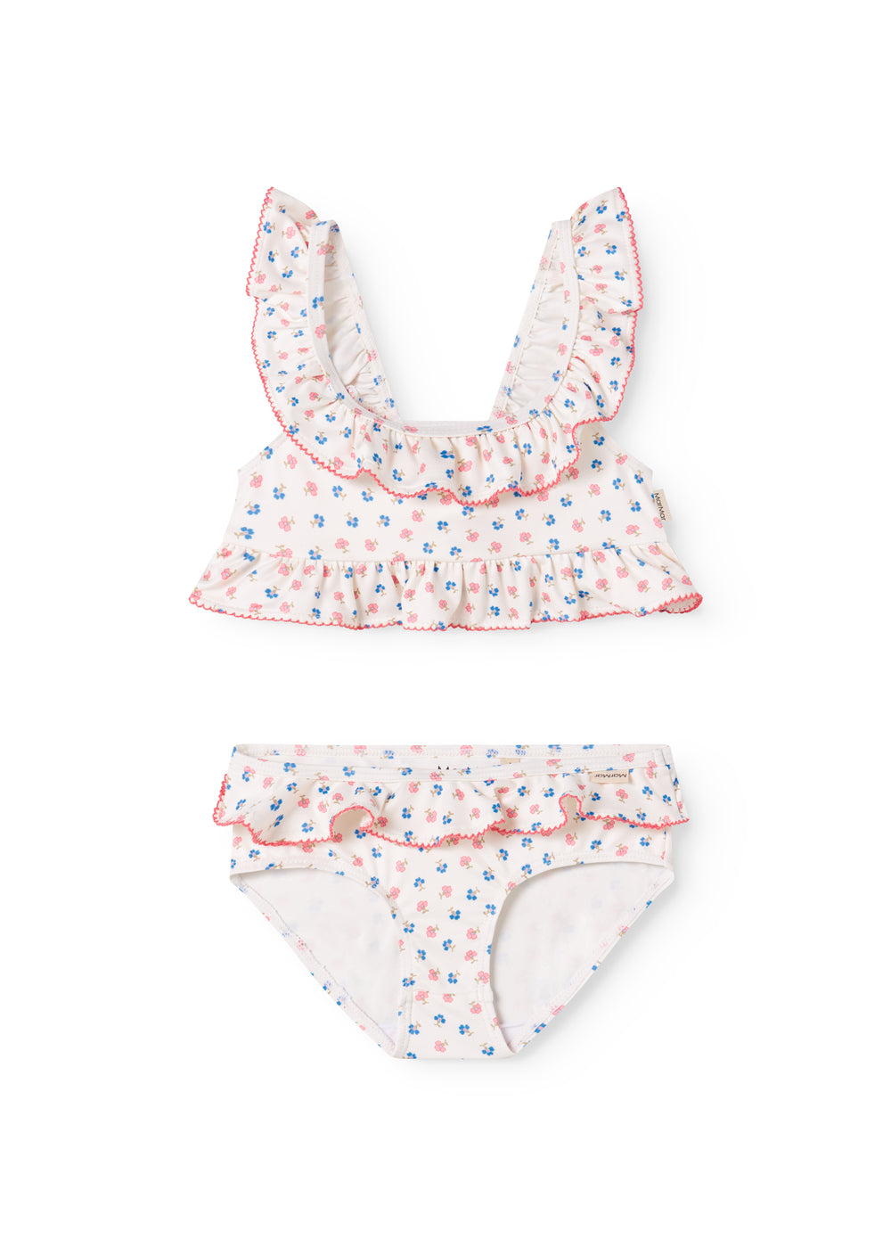 Bikini with top and bottom. The bikini has nice ruffle details and picot edges on both the top and bottom. The bikini has a nice floral print and is comfortable to wear.
