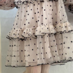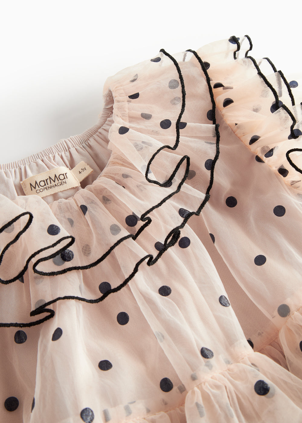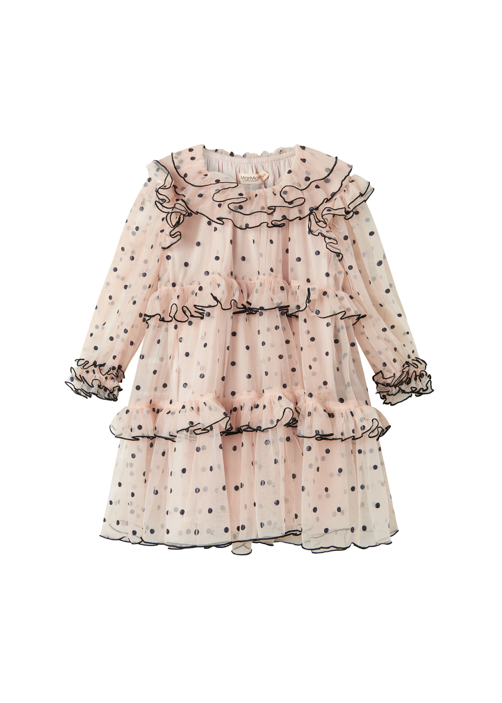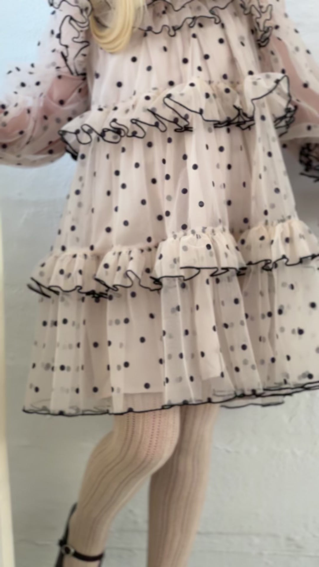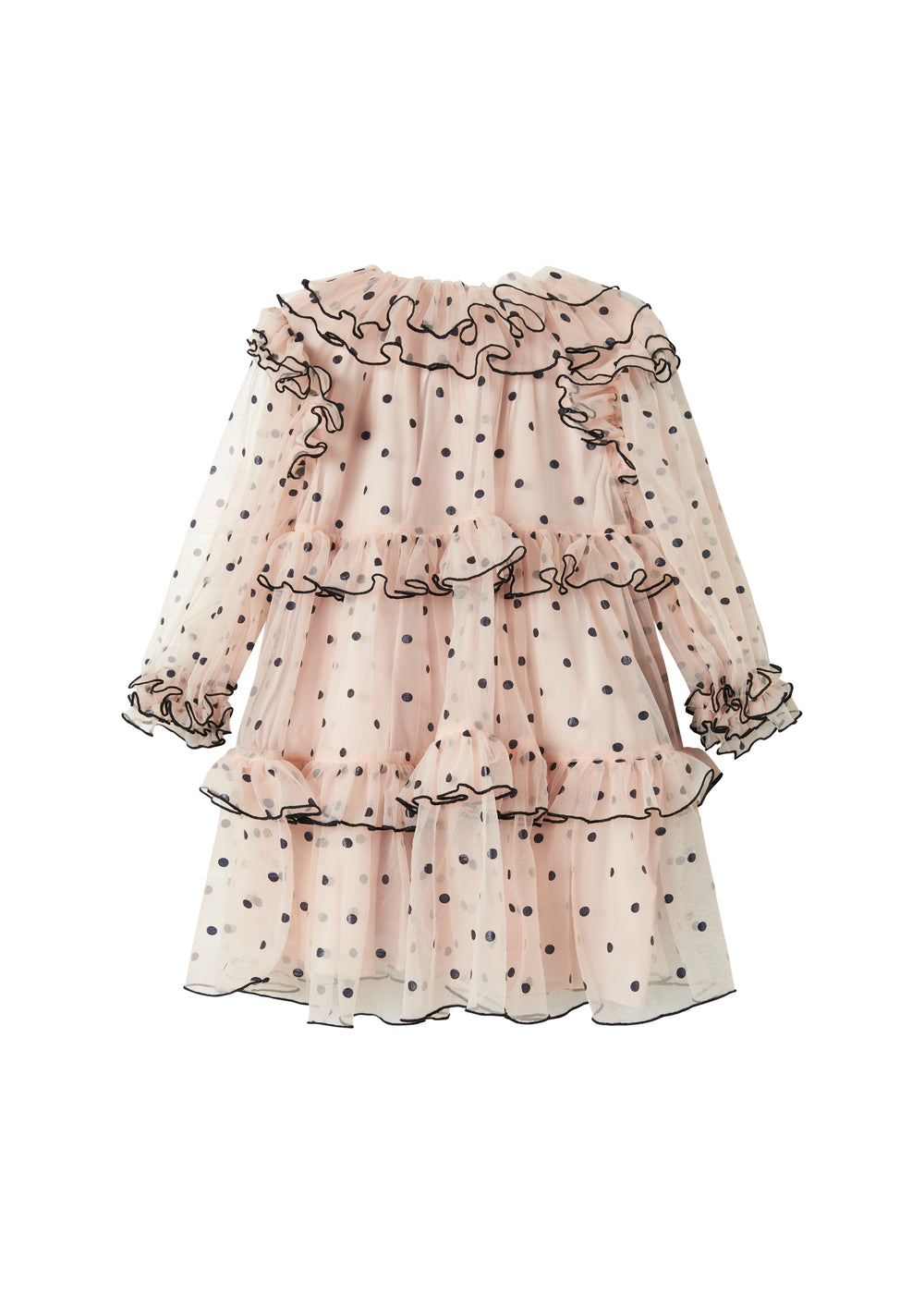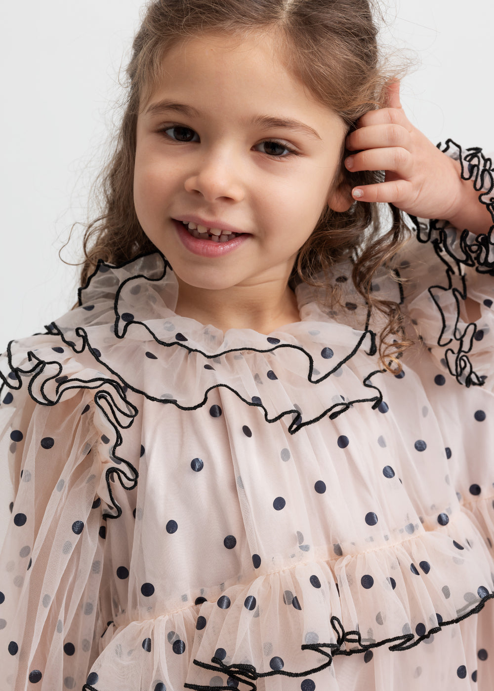 Short-sleeved dress for children with many layers of tulle for volume. The dress has beautiful metallic dots, a nice round collar with tulle ruffles and contrasting edging. The length of the dress goes above the knees.