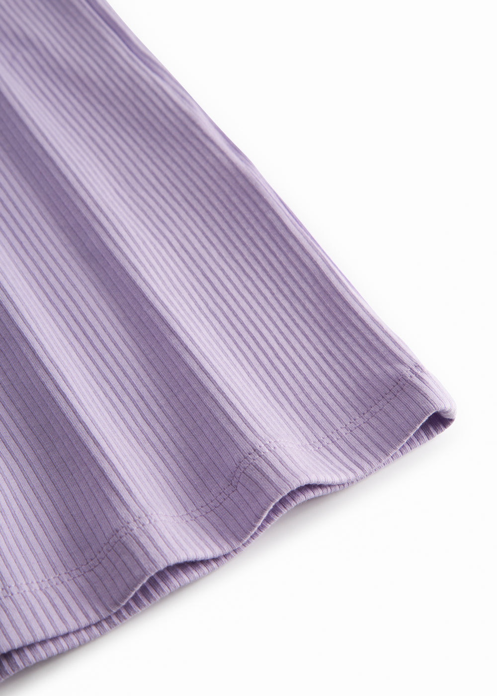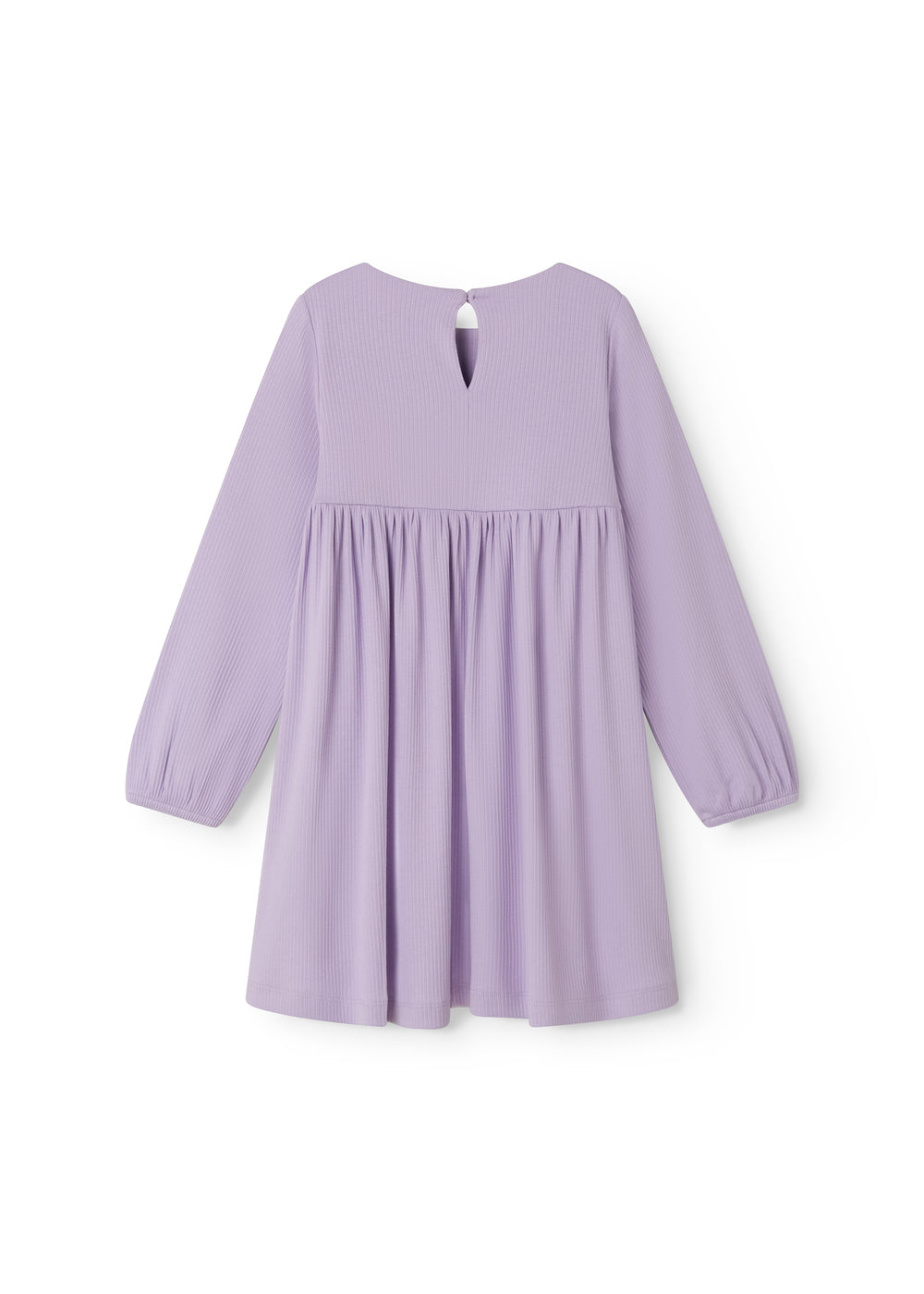 Long-sleeved dress for children. The dress has elastic in the sleeves, button closure at the back and a beautiful skirt. The dress is ribbed and is both soft, stretchy and comfortable to wear. The length of the dress goes above the knee.