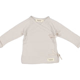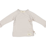 Long-sleeved blouse for newborns with wrap-around closure. Closes with snaps and ties.