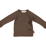 Long-sleeved blouse for newborns with wrap-around closure. Closes with snaps and ties.
