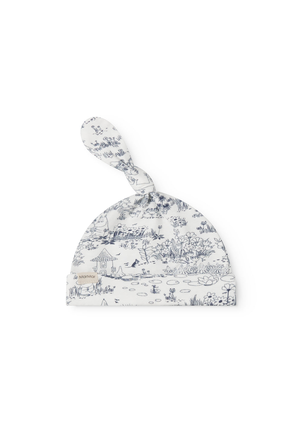 Small hat for newborns with a fold-down brim and a cute knot on top. The hat has a cute Moomin print and is soft, stretchy and comfortable to wear.