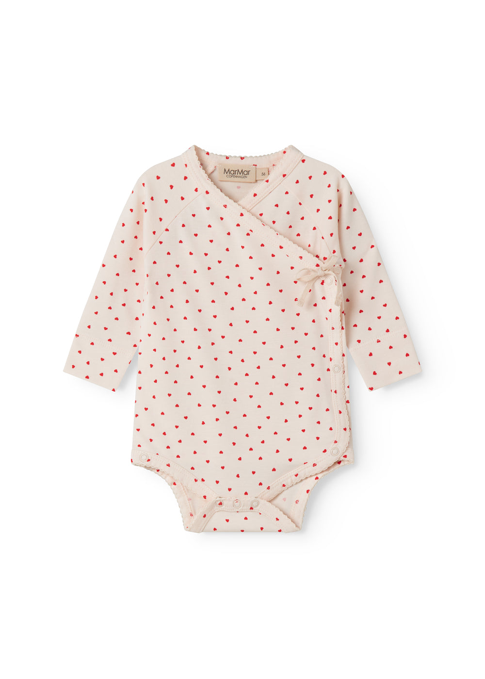 Long-sleeved bodystocking for newborns with a wrap-around closure and a sweet heart print. The bodystocking closes with snaps and ties, has picot edges and is both soft, stretchy and comfortable to wear.