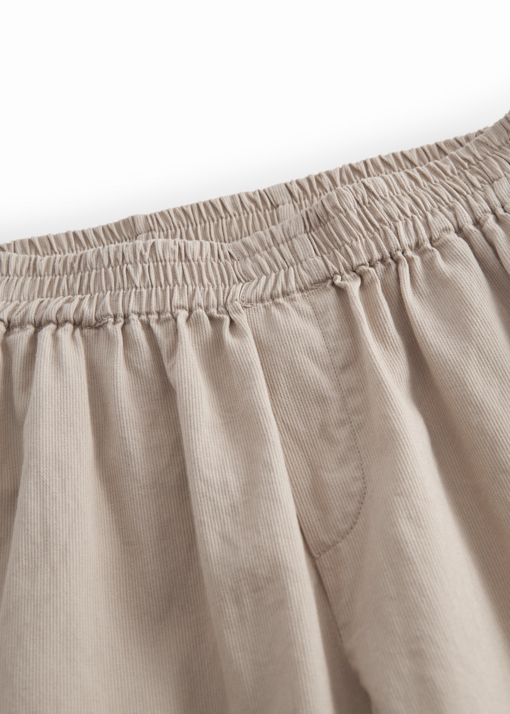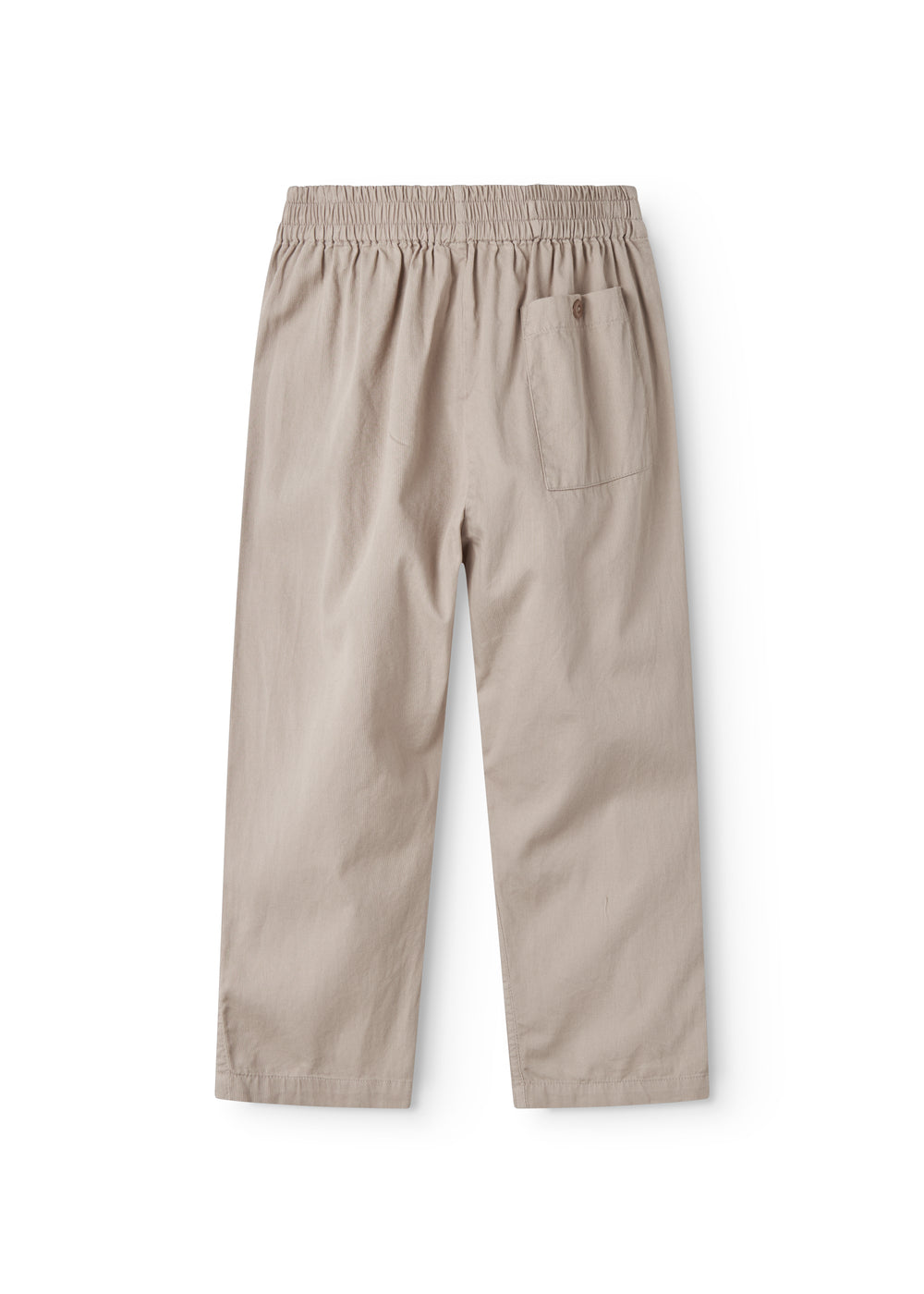 Comfortable loose-fitting trousers for children with an elasticated waist and a back pocket with button closure. The trousers are made of soft cotton with a delicate texture.