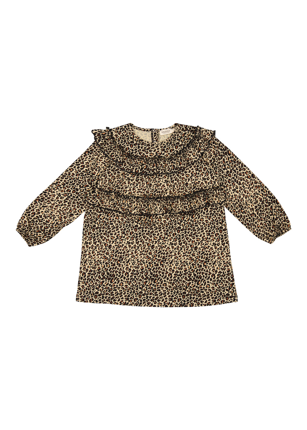 Cute long-sleeved dress with fine ruffles and button closure at the neck. The length of the dress goes above the knee.