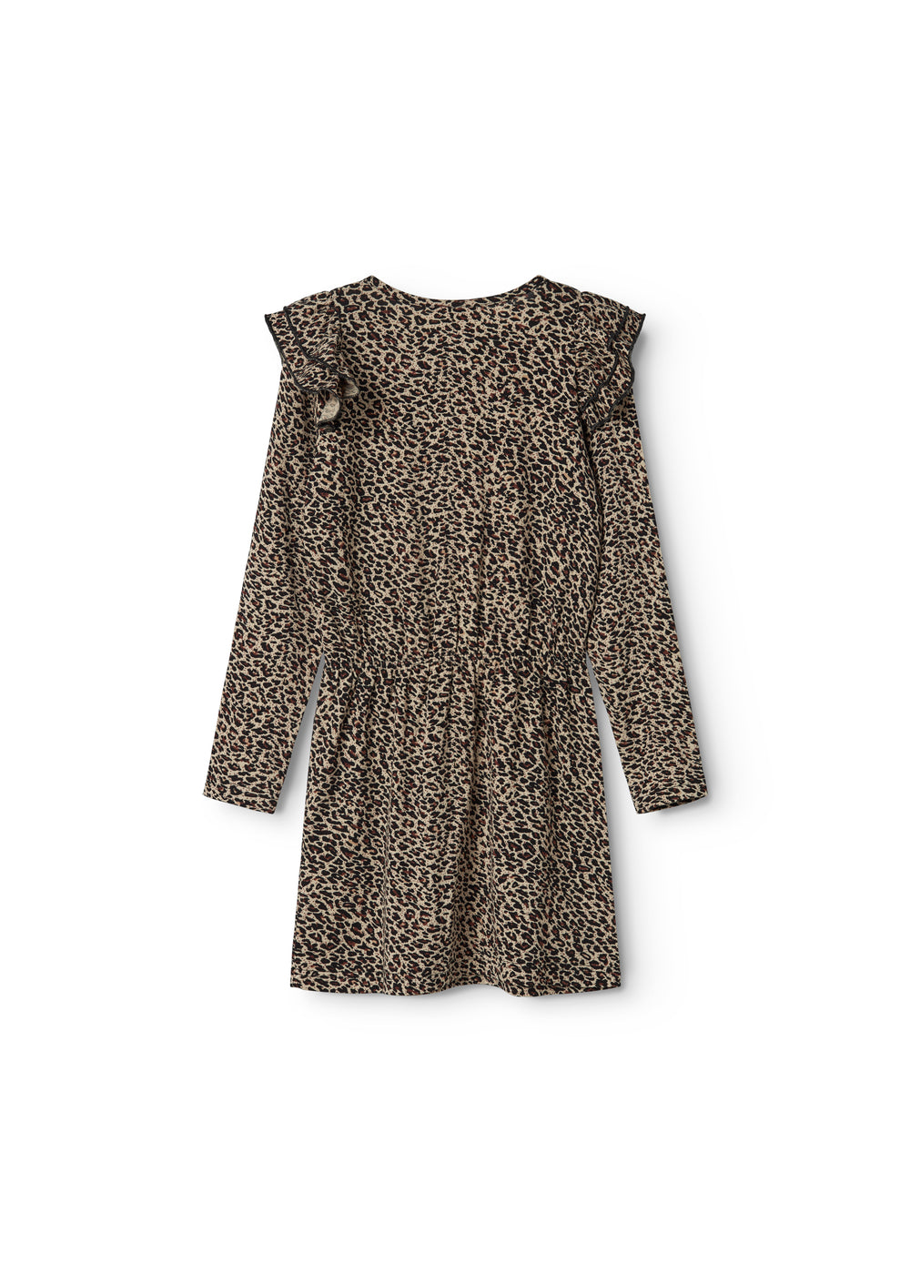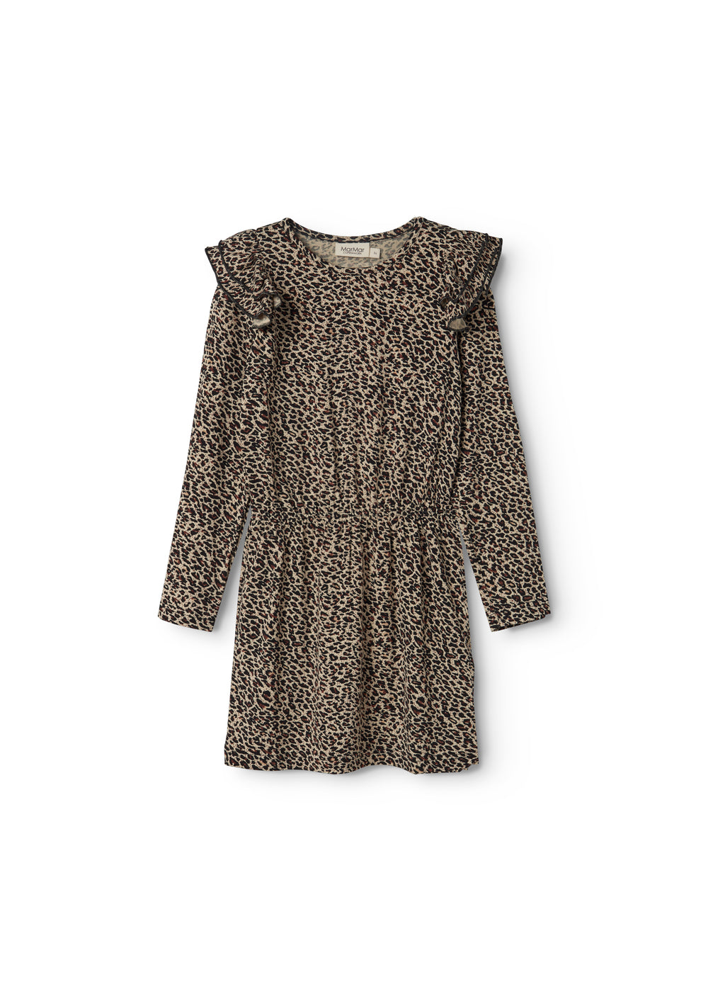 Dress with ruffles on the shoulder, elastic waist and long sleeves. The length of the dress goes above the knee.