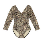 Long-sleeved gymnastics leotard with V-shaped neckline at the front and back.