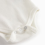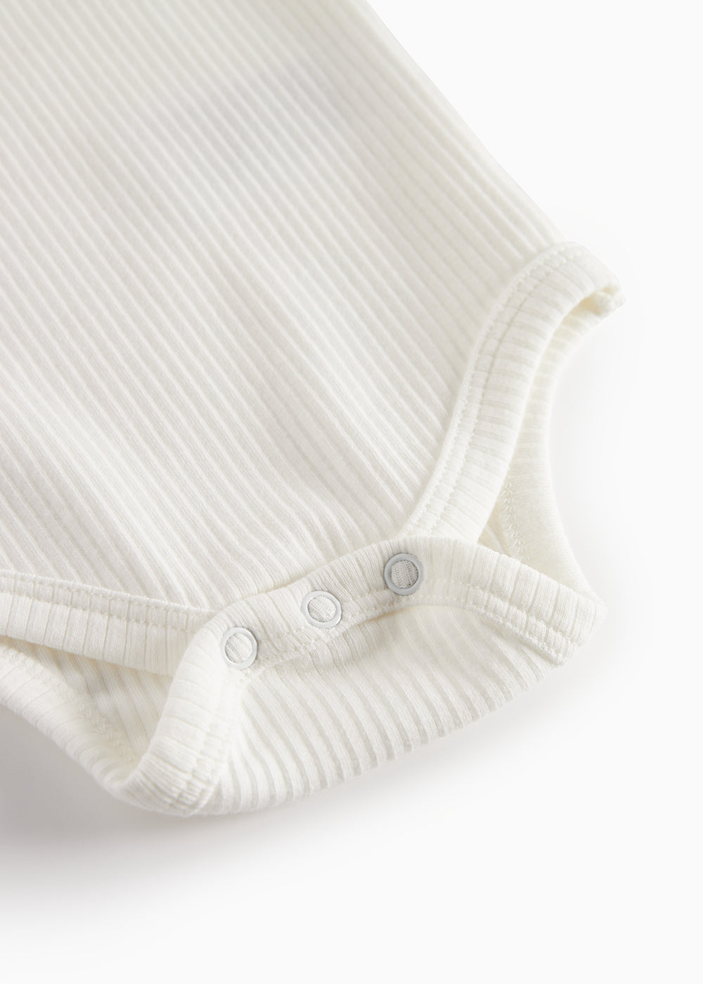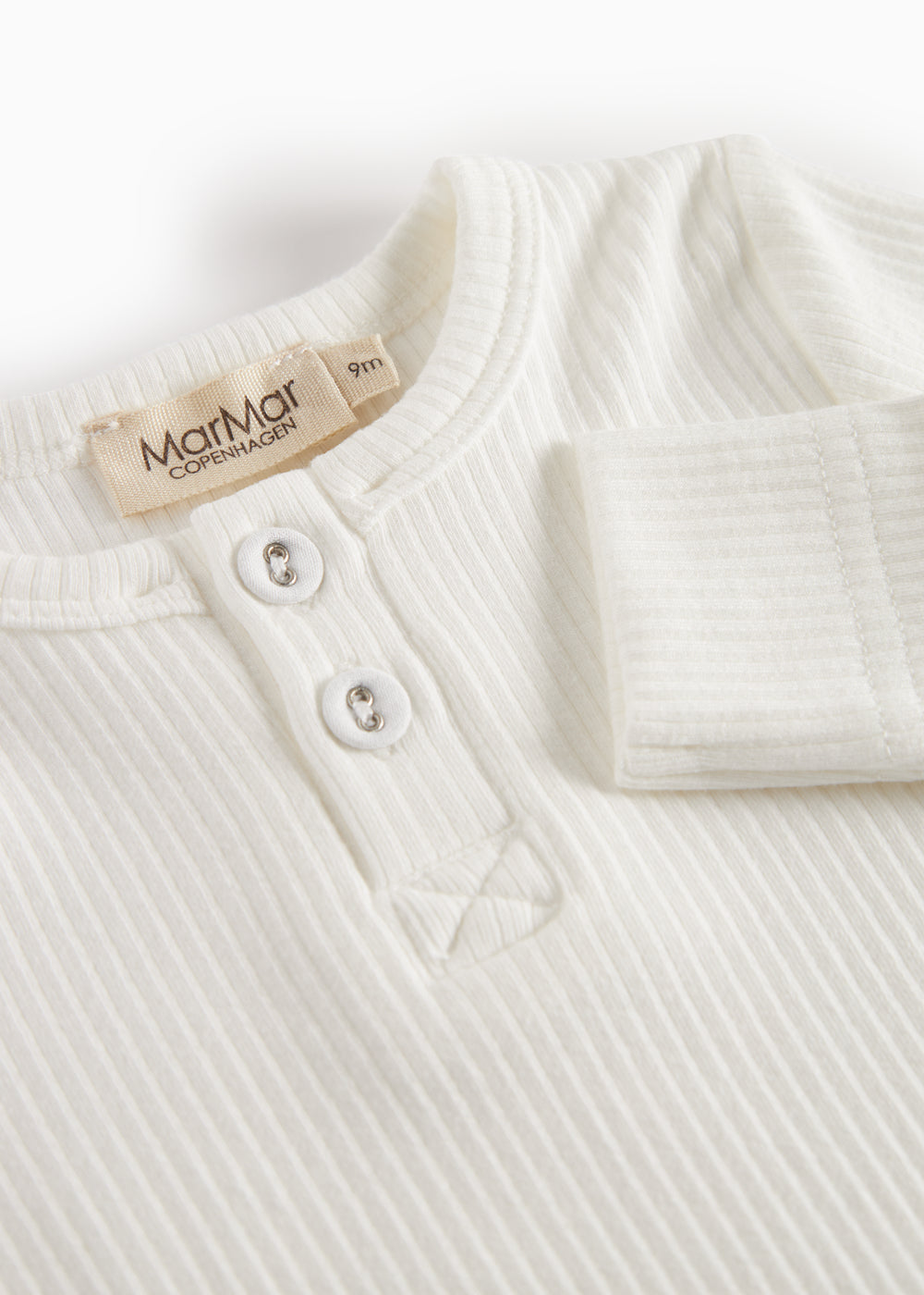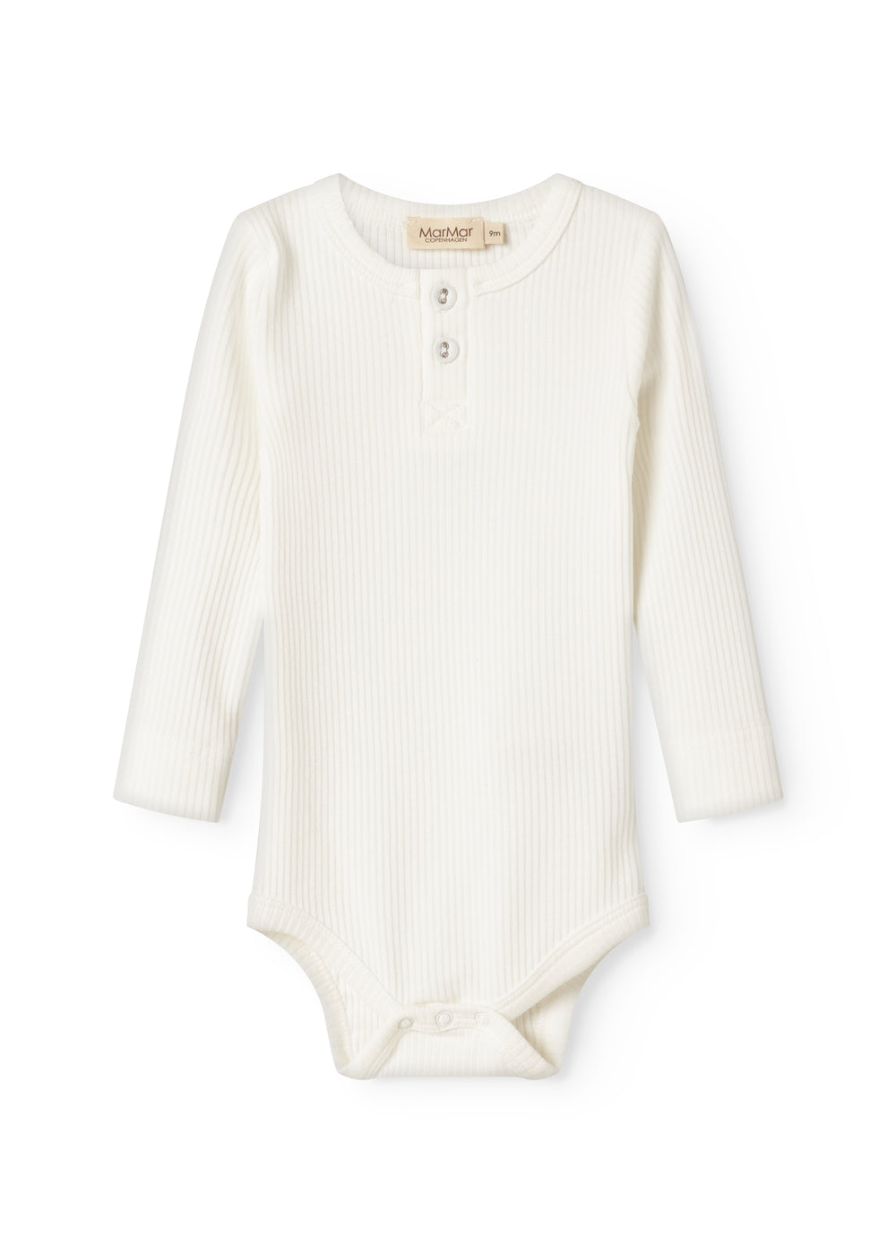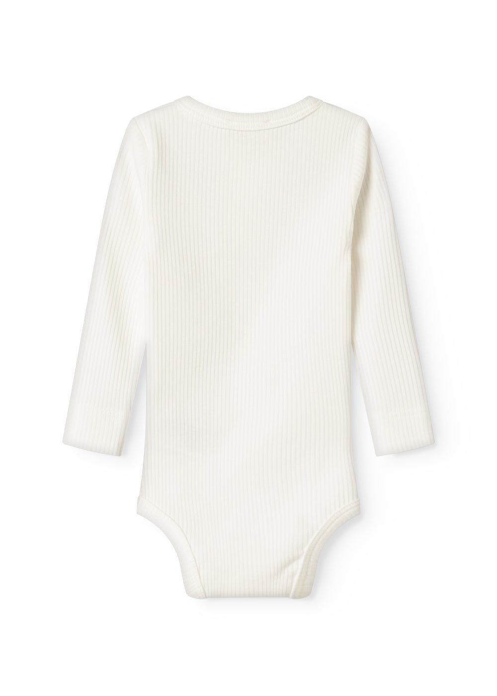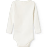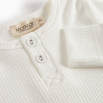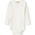 Long-sleeved baby modal bodystocking with placket button closure that is closed with snaps between the legs for easy diaper changes.