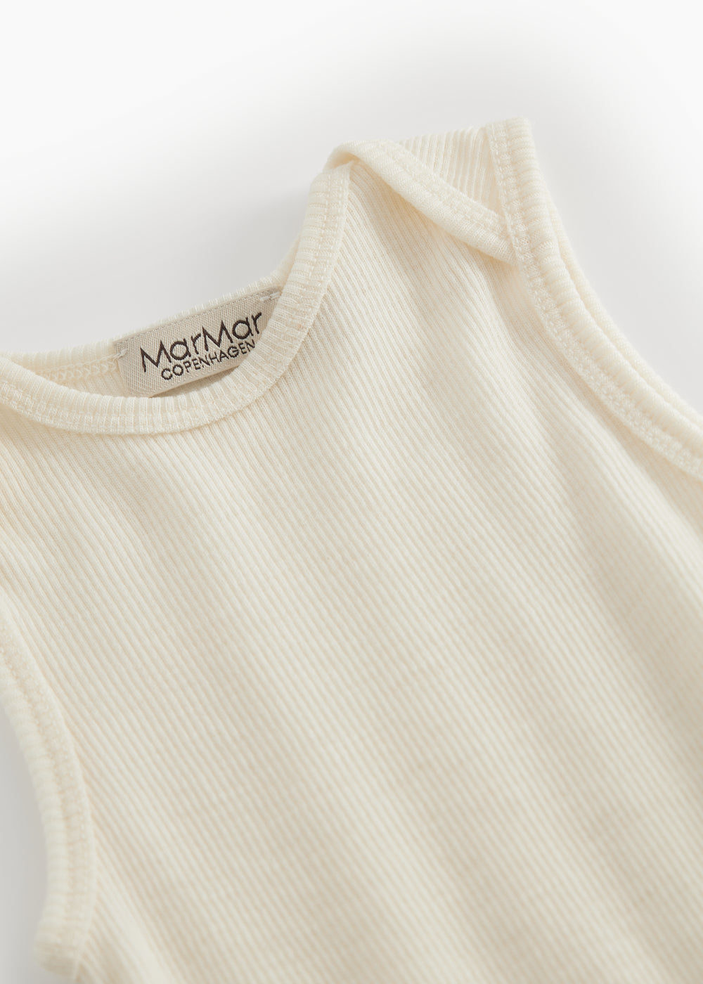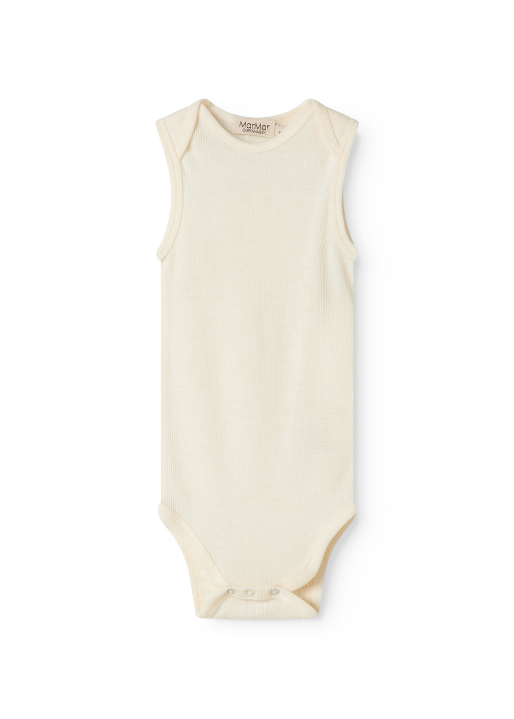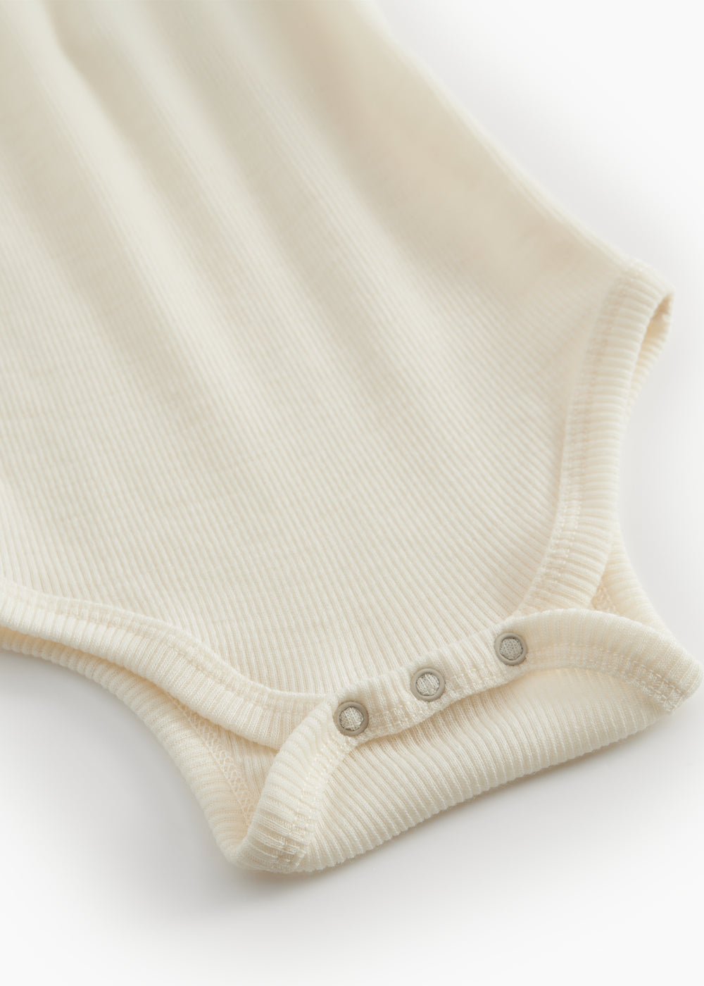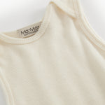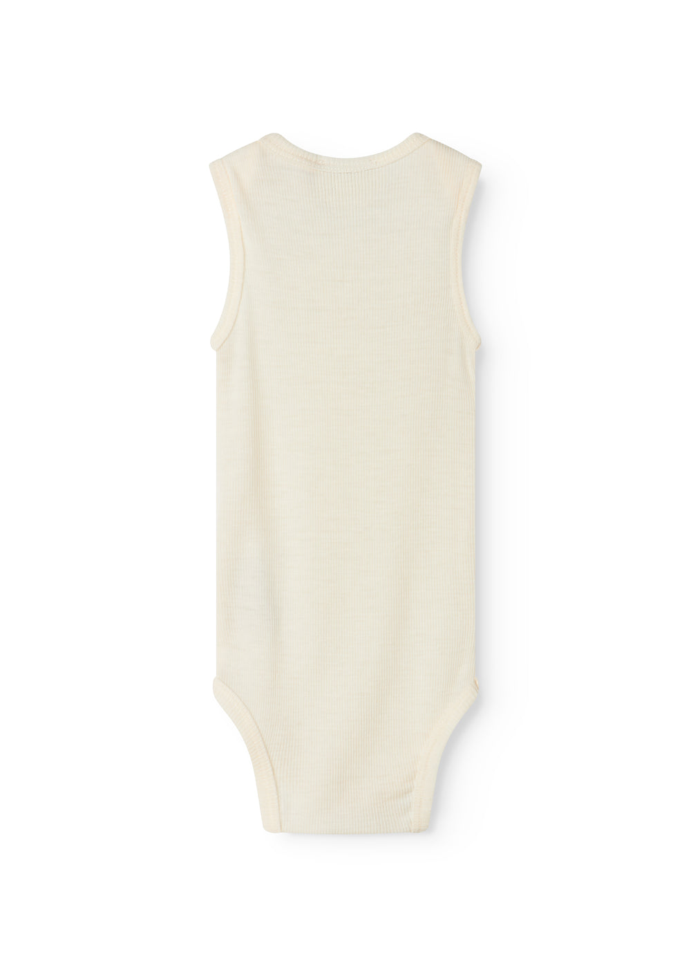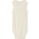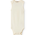 Sleeveless bodystocking with a smart neck opening without buttons that can be easily pulled down the body. Closes with snaps between the legs for easy diaper changes.