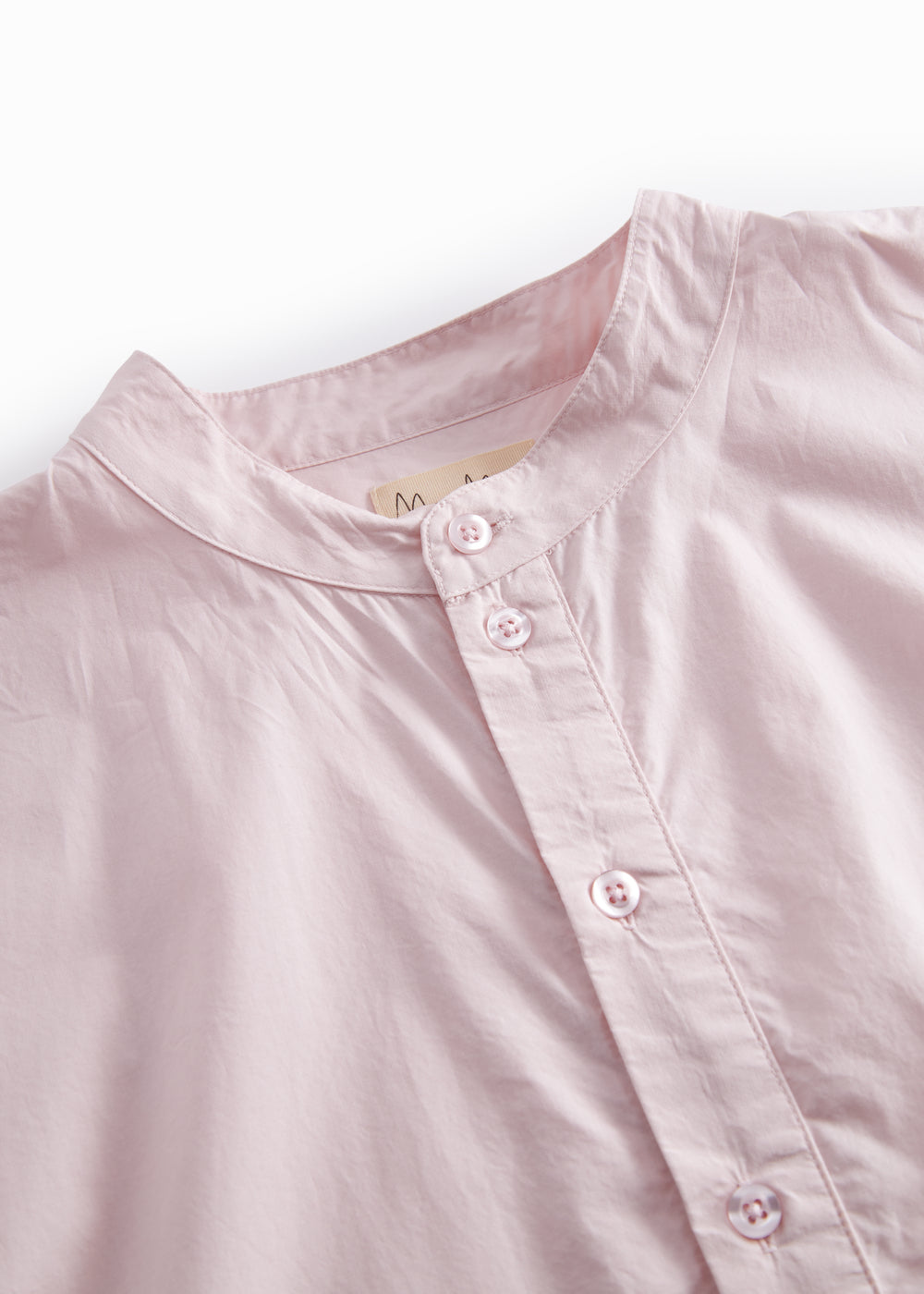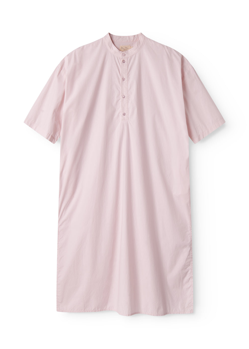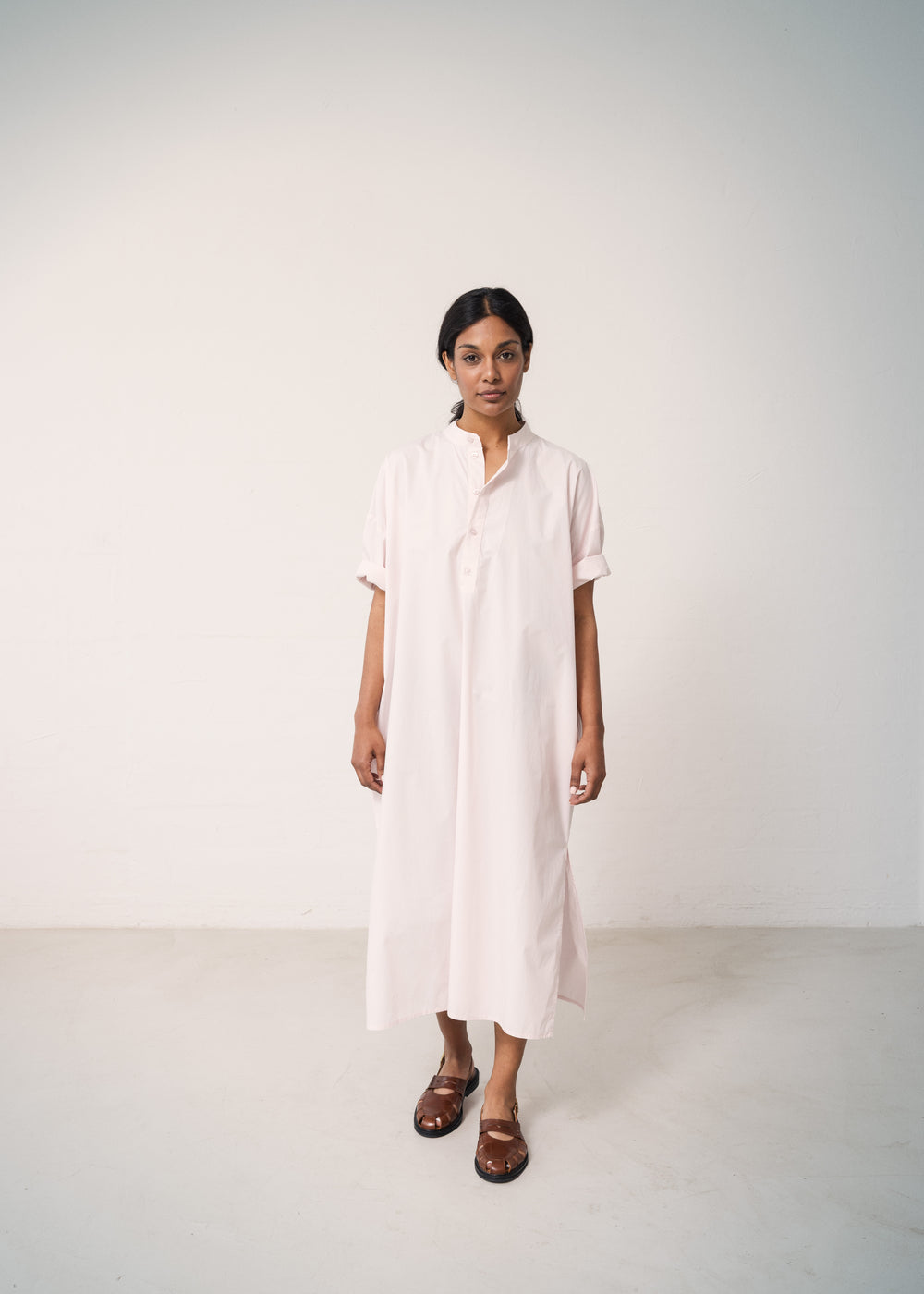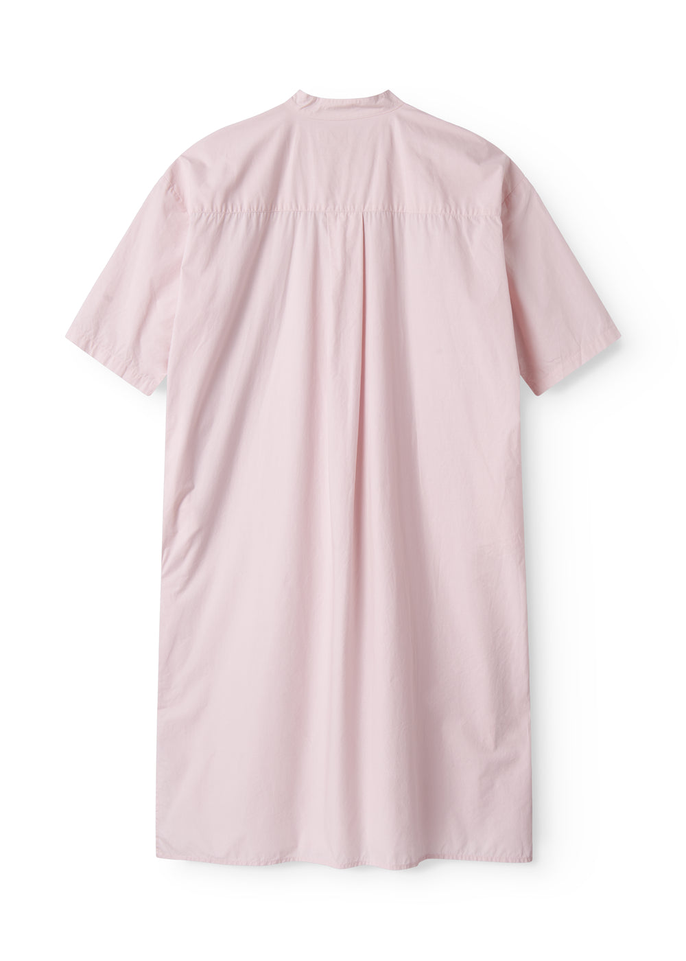 Short-sleeved dress for women with a mandarin collar and half-button closure at the front. The dress has a loose and relaxed fit and a light and crispy cotton quality, which makes it comfortable to wear. The length of the dress goes down above the knees.