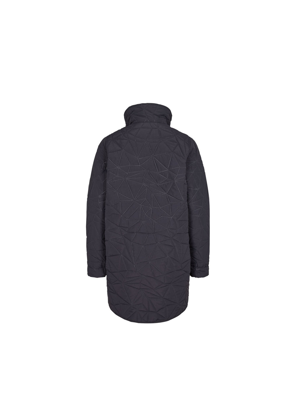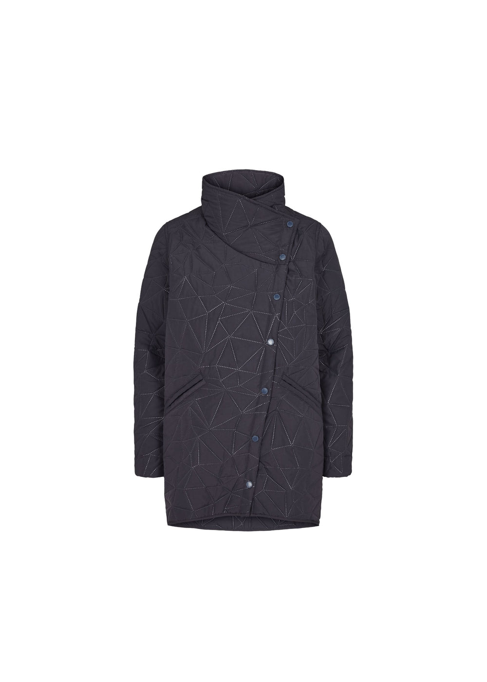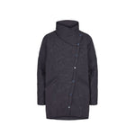 Long and practical thermal jacket with front pockets. The jacket has an asymmetrical snap closure and a large collar.