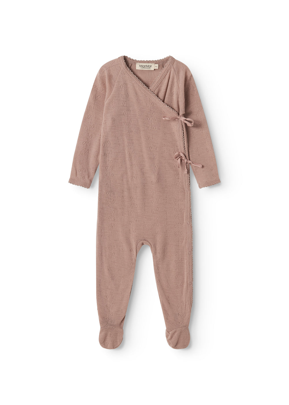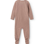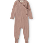 Long-sleeved jumpsuit with feet for newborns. The jumpsuit has a wrap-around closure and closes with snaps and ties.
