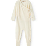 Long-sleeved jumpsuit with feet for newborns. The jumpsuit has a wrap-around closure and closes with snaps and ties.