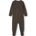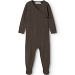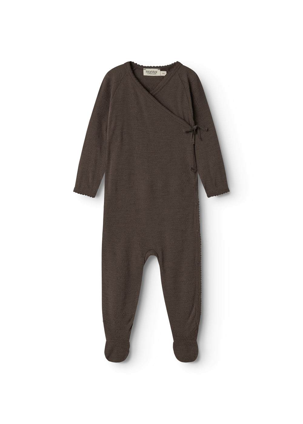 Long-sleeved jumpsuit with feet for newborns. The jumpsuit has a wrap-around closure and closes with snaps and ties.