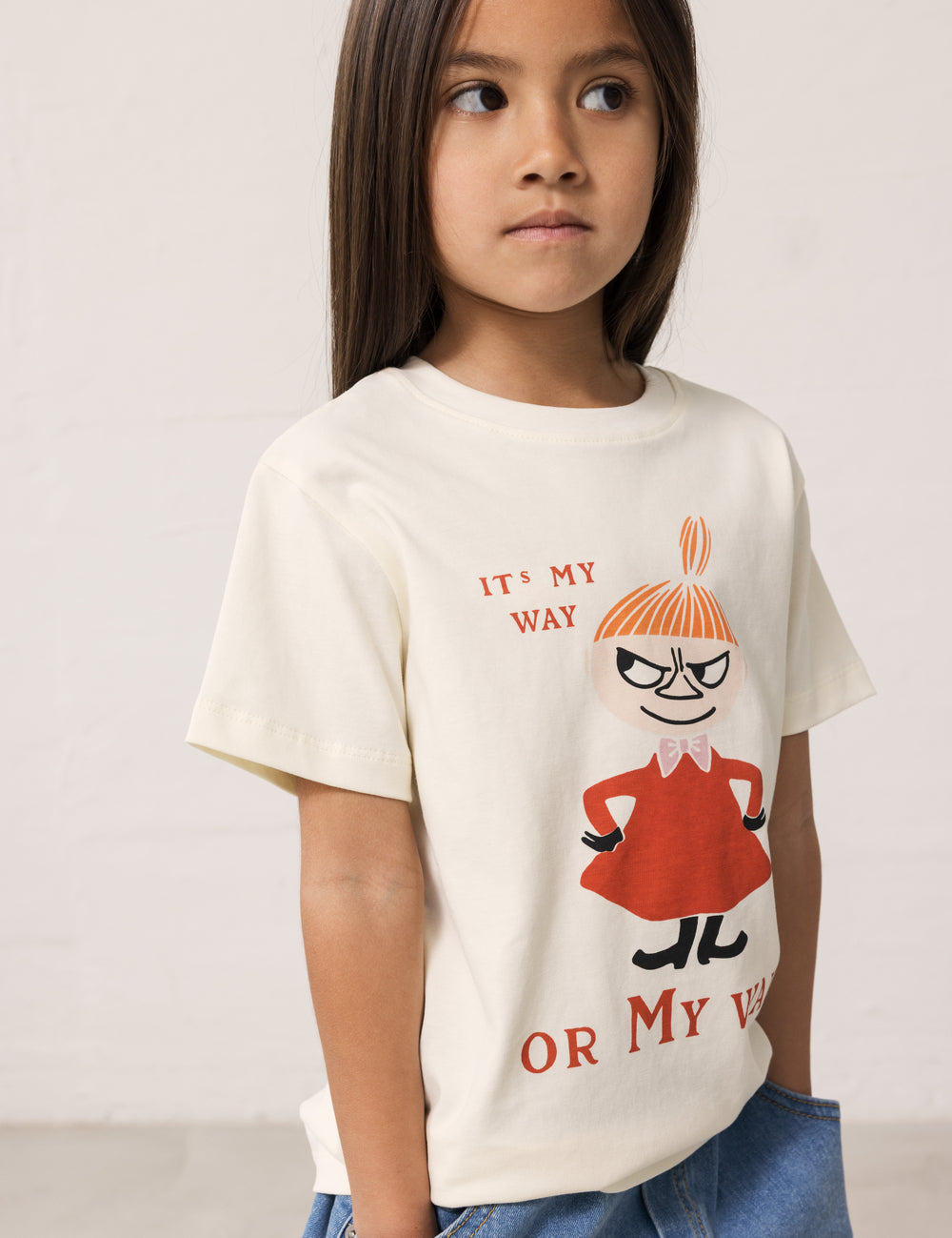 Children wearing a white T-shirt with Mumin print and denim shorts.