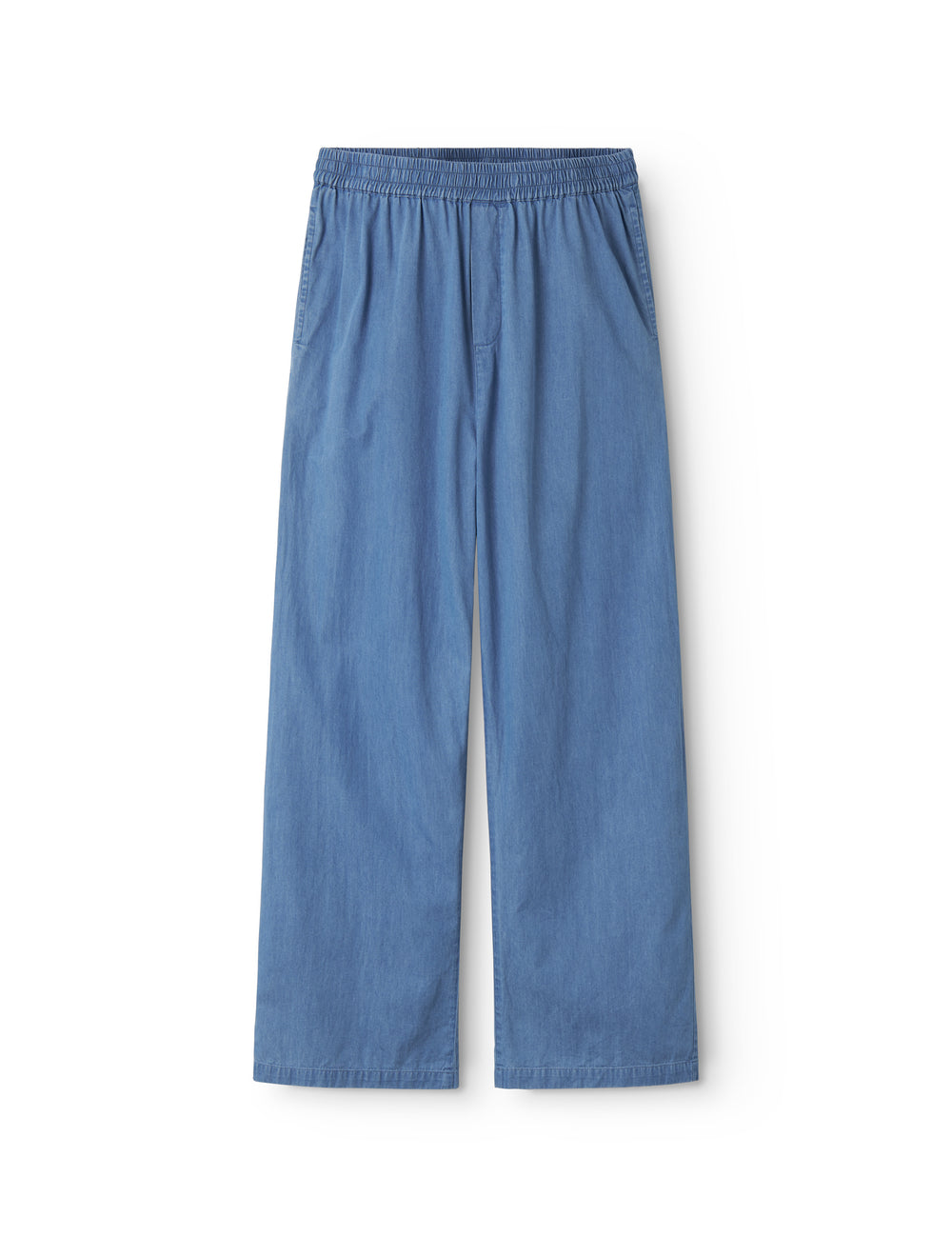 Woman wearing a blue denim shirt and loose denim pants.