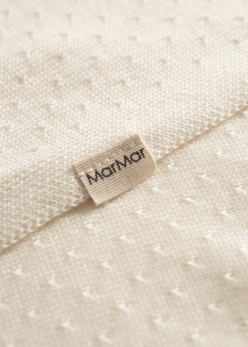 Knitted blanket with a fine openwork pattern, measures 70cm x 100cm.