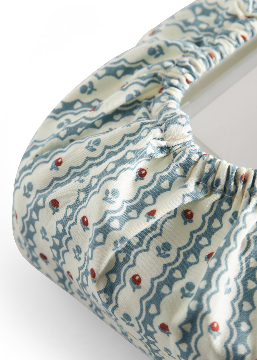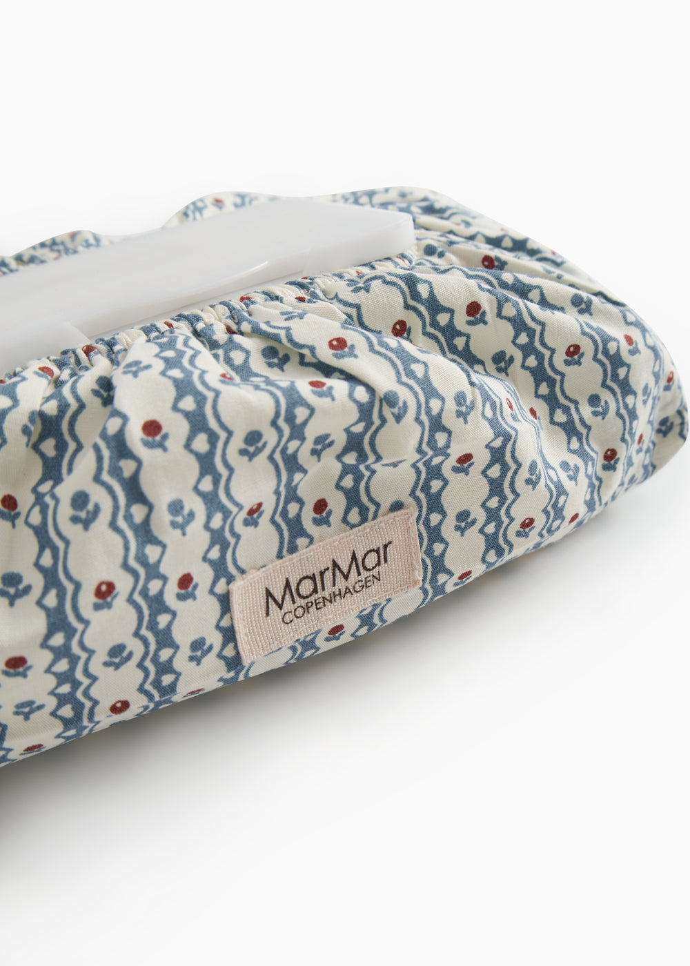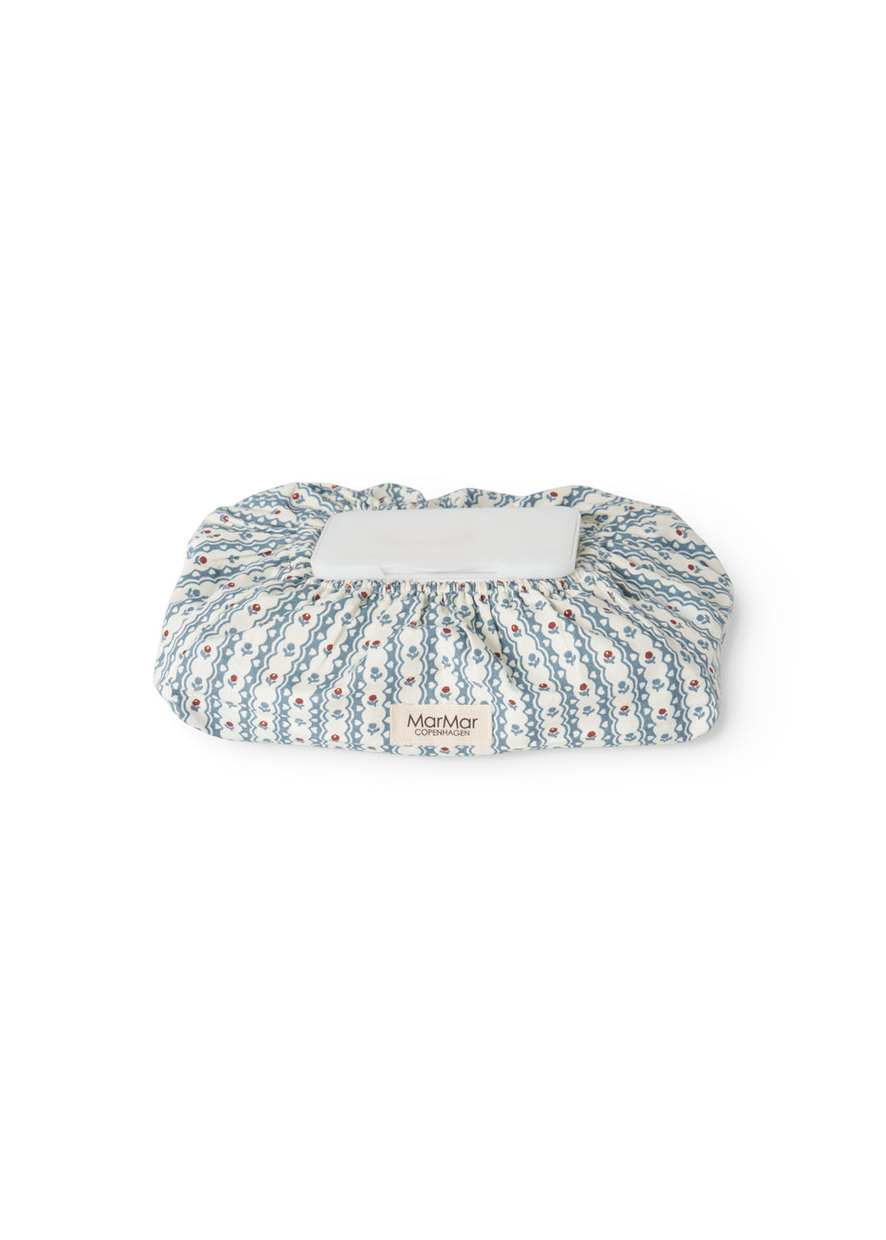 Wet wipe cover with elastic closure that fits around the lid. Fits a standard size pack of wet wipes. Measures 20cm x 12cm.